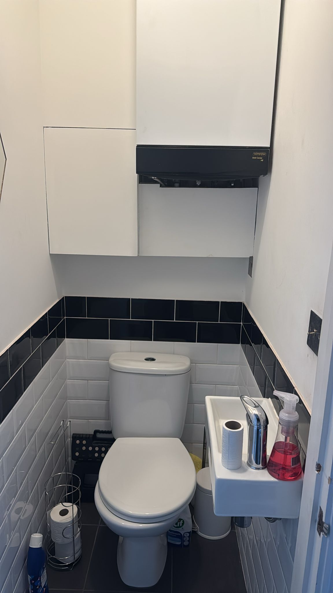 change the toilet seat to black wooden cover the boiler at the back with panelling add a bright patterned wall paper above the tiles