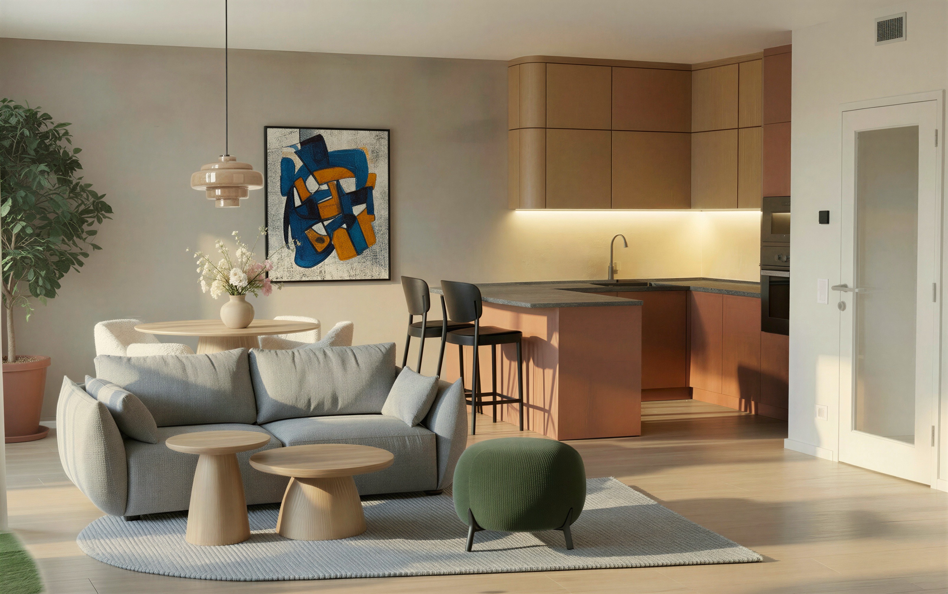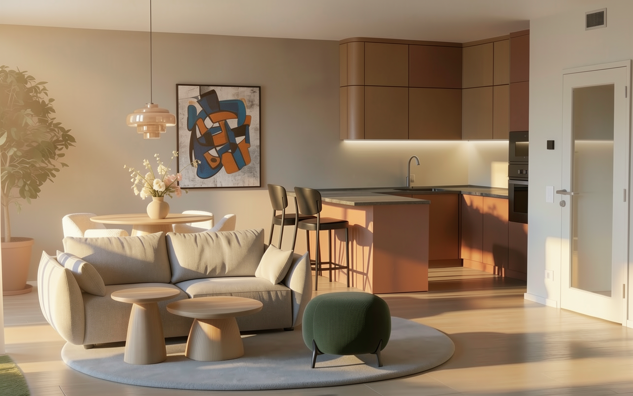 use the provided render strictly as the base image keep the camera angle layout furniture placement lighting materials and architecture exactly the same modify only the shape of the rug under the sofa and coffee tables the rug is currently partially rectangular with a straight edge on the right side change the rug so that it becomes a perfect regular circle change the carpet color to light gray color the rug should have smooth evenly rounded edges and form a clean circular shape centered under the sofa and coffee tables keep the same rug material color texture and scale as in the original render do not change any furniture objects lighting or other elements in the scene only adjust the rug shape so it becomes a circular rug