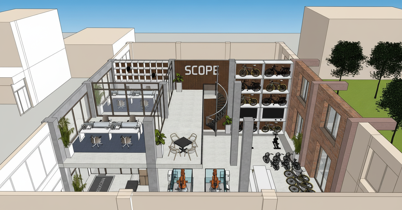 use natural neutral light colors and materials like beige creme white and natural stone italian modern style in a quite urban village environment with people around and vegetation trees garden