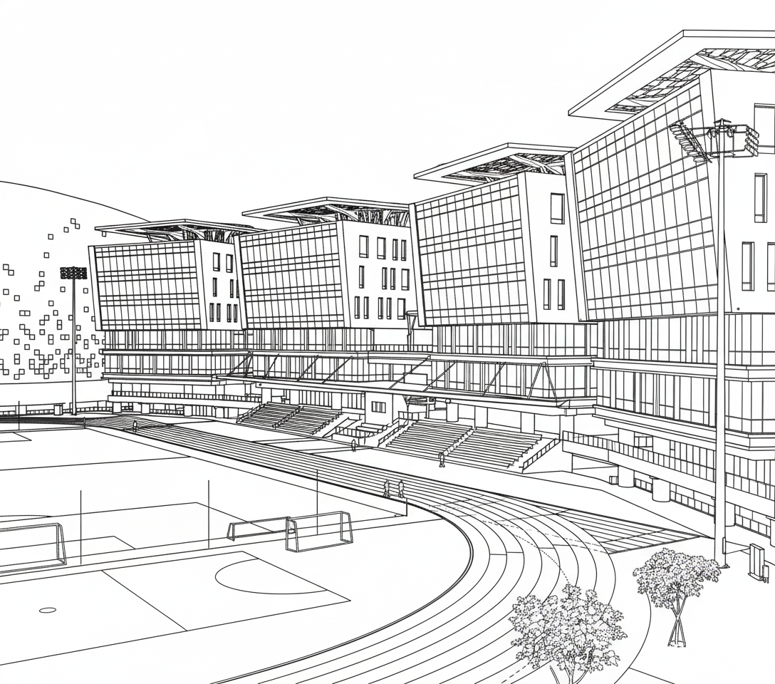 turn into photo realistic rendering with bright california sunrise shining at front and bright lights inside the building shining through all the windows add street lights