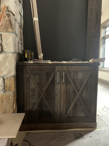 do not change the cabinets in any way preserve the exact cabinet colors materials finishes dimensions door and drawer styles hardware spacing alignment and all geometry exactly as shown do not alter the countertop shape backsplash appliances flooring lighting fixtures or wall structure only remove the construction materials clutter and mess from the scene clean the room and make it look finished and staged add a few simple tasteful home accessories appropriate for the style of the space but do not add or remove any furniture windows or architectural elements maintain the original lighting direction and realism enhance clarity and polish the photo while keeping the cabinetry and room design completely unchanged do not alter the lighting to keep the cabinet colors as they are in the image restage the top for a farmhouse living room add new flooring and put a picture on the wall