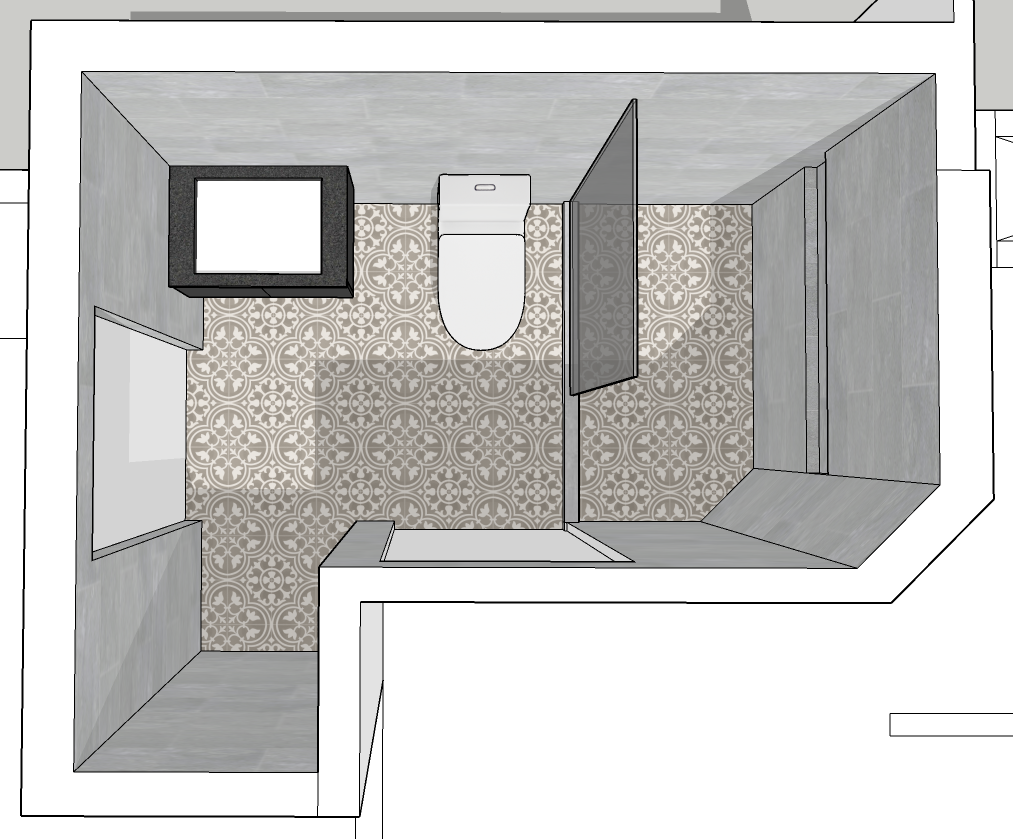 create a beautifully rendered modern bathroom based from the perspective include a black granite vanity counter with undercounter lavatory sink with a satin silver faucet above the sink hang a simple mirror with black border the walls should be 30x60cm gray cement finish tiles the shower wall in the right portion has a soap niche the floor is 20x20cm machuca pattern tiles incorporate a satinsilver towel rack with beige towels ensure warm ambient lighting architecture