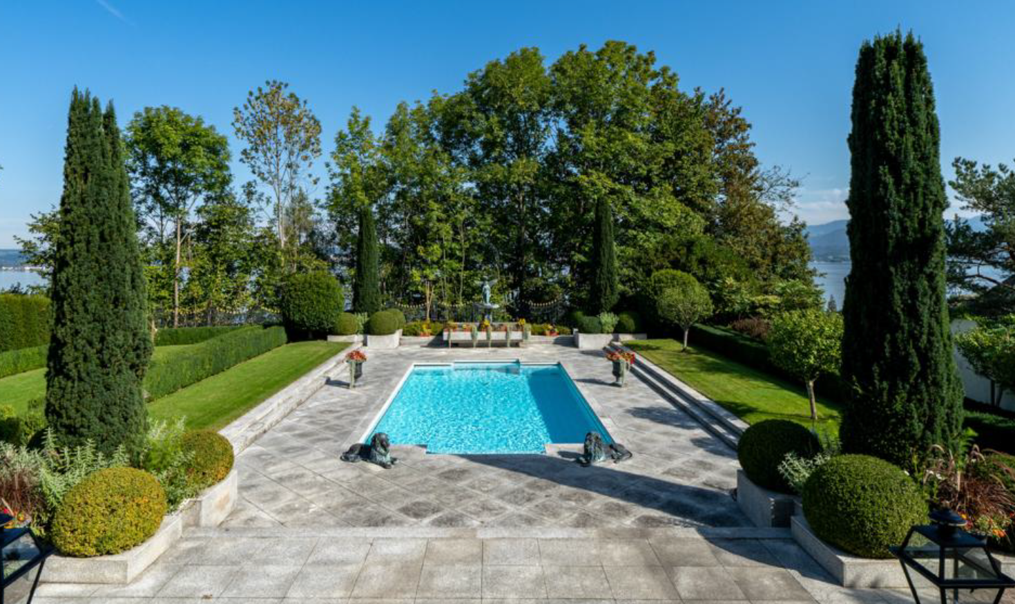 genau dieses foto berarbeiten gartenplatten ersetzen mit hellbeigen grossfl chigen platten und sitzplatz aufr umen pool sanieren mit einem edelstahlinliner pool leer visualisieren auf der linken seite die hecke in der mitte entfernen englischer rasen mit m hermuster fotorealistisches foto exakt dieselbe perspektive und kameraposition wie das hochgeladene referenzbild 100 identische geometrie exakt gleiche anordnung exakt identische fensterpositionen mit gleichem ausblick durch die fenster weiches nat rliches tageslicht leicht schr g einfallende sonne durch die fenster alle r ume hinter den fenstern k nstlich ausleuchten sanfte realistische schatten realistische materialien echte texturen hochwertige oberfl chenreflexionen blickrichtung ist nach norden sonnenlicht kommt von westen echtes wasser im pool oder see sehr realistische umgebung belebte szene mit menschen im vordergrund poolboy g rtner nat rlicher himmel mit leichter bew lkung nat rliche farbwiedergabe leicht warme farbstimmung golden hour feeling das bild muss wie eine professionelle fotografie aussehen es soll ein echtes und reales foto sein canon eos r5 35 mm festbrennweite f 2 8 hyperrealistisch dslr qualit t raw aufnahme 8k aufl sung extrem scharf perfekte tiefensch rfe professionelle architekturfotografie