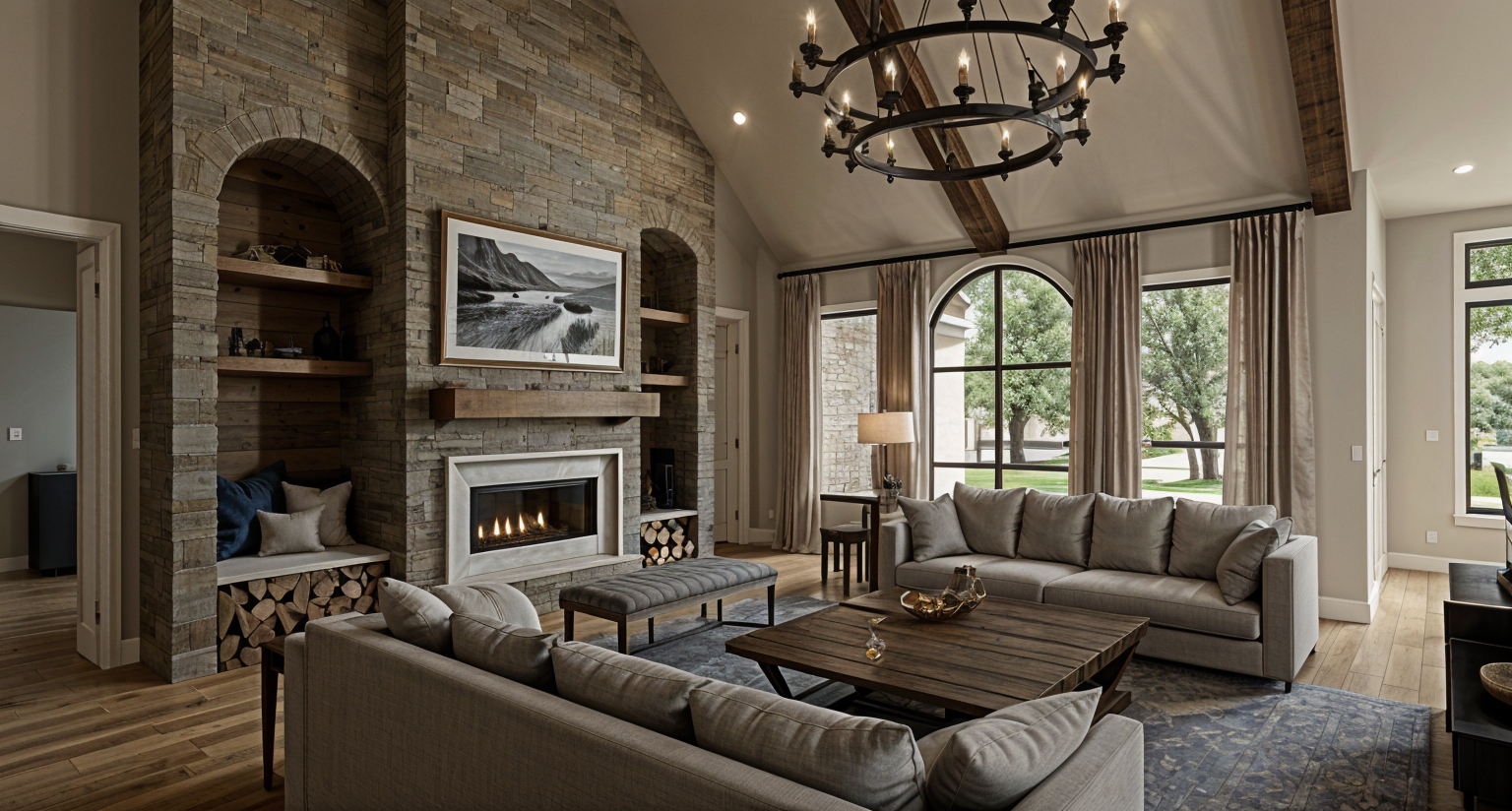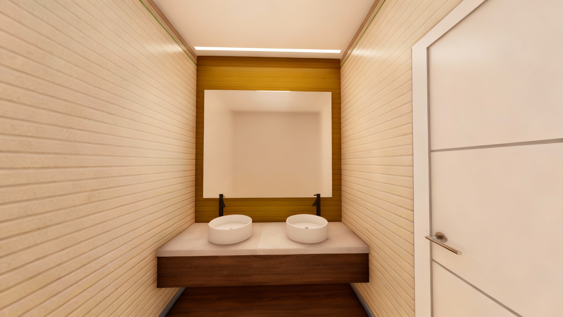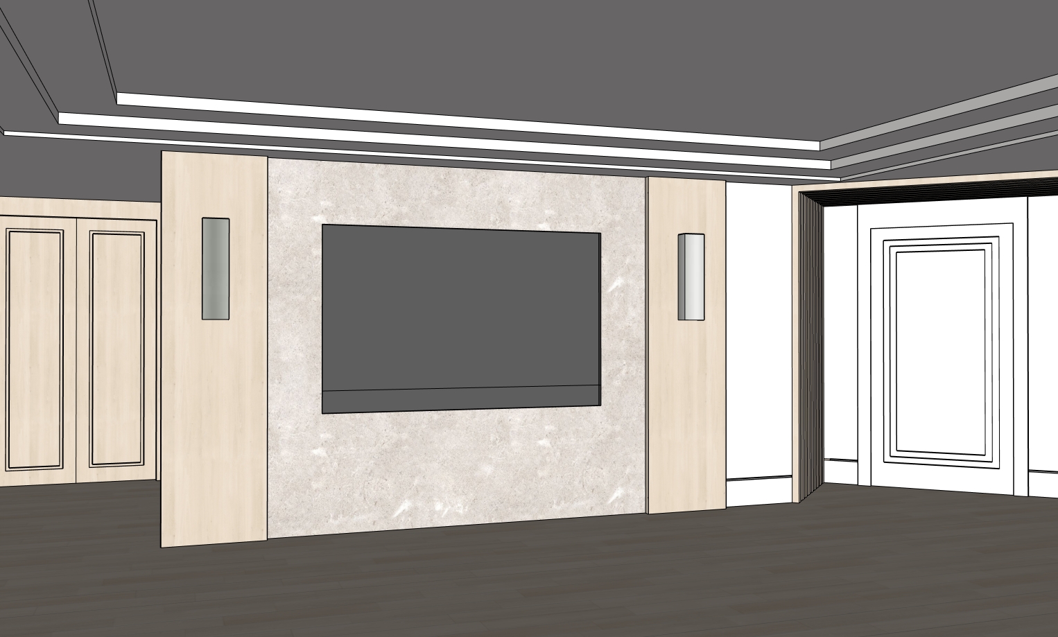 transform the provided perspective image into a hyper realistic architectural daylight rendering with the same depth scale and realism as a high end architectural visualization maintain the exact original geometry ceiling details wall depths hallway opening on the left and door on the right with zero layout changes match the overall realism camera distance and grounded architectural feel of a professional design visualization similar to a built space mockup not a styled interior photo apply these exact finishes walls painted benjamin moore oc 26 silver satin soft neutral gray with no beige or blue cast feature wall finished in crystal ice by umi subtle mineral texture low contrast vertical panels in white rift oak with straight linear grain matte finish light desaturated tone flooring is craft floor avila light neutral wood low sheen natural variation no yellow warmth trim and ceiling in sherwin williams sw7005 pure white crisp and clean install elongated wall sconces matching visual comfort melange 28 inch in polished nickel at the exact locations shown reflective but not glowing lighting must be soft neutral daylight evenly distributed architectural calm and realistic no dramatic shadows no night lighting no stylization