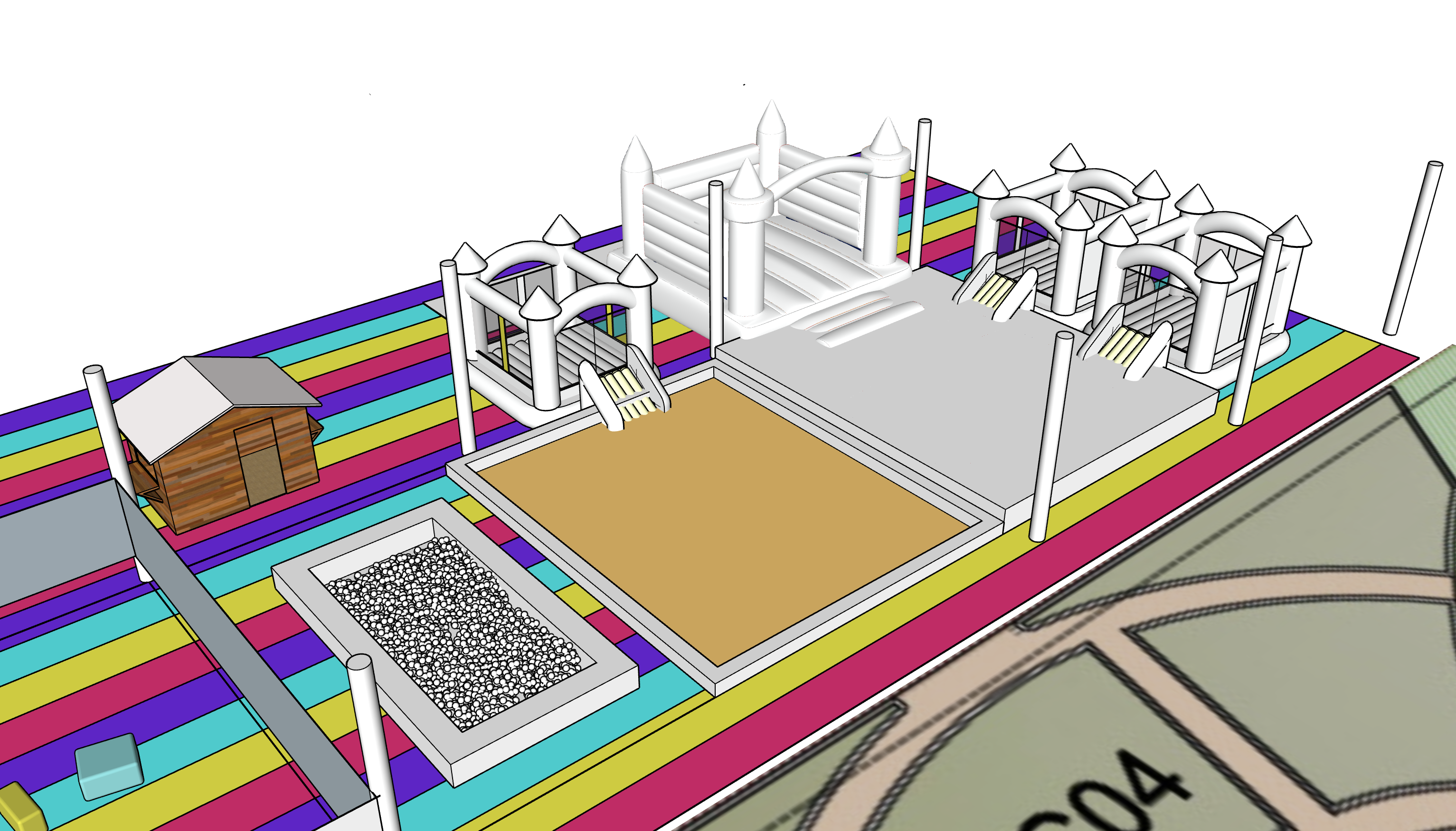 the pavement is artificial colored grass on the bottom left there is a garden with little street in the center is a square of 70mq of sand with kids playing all the bounce house are white and on the bottom left there is a ball pit with pink balls