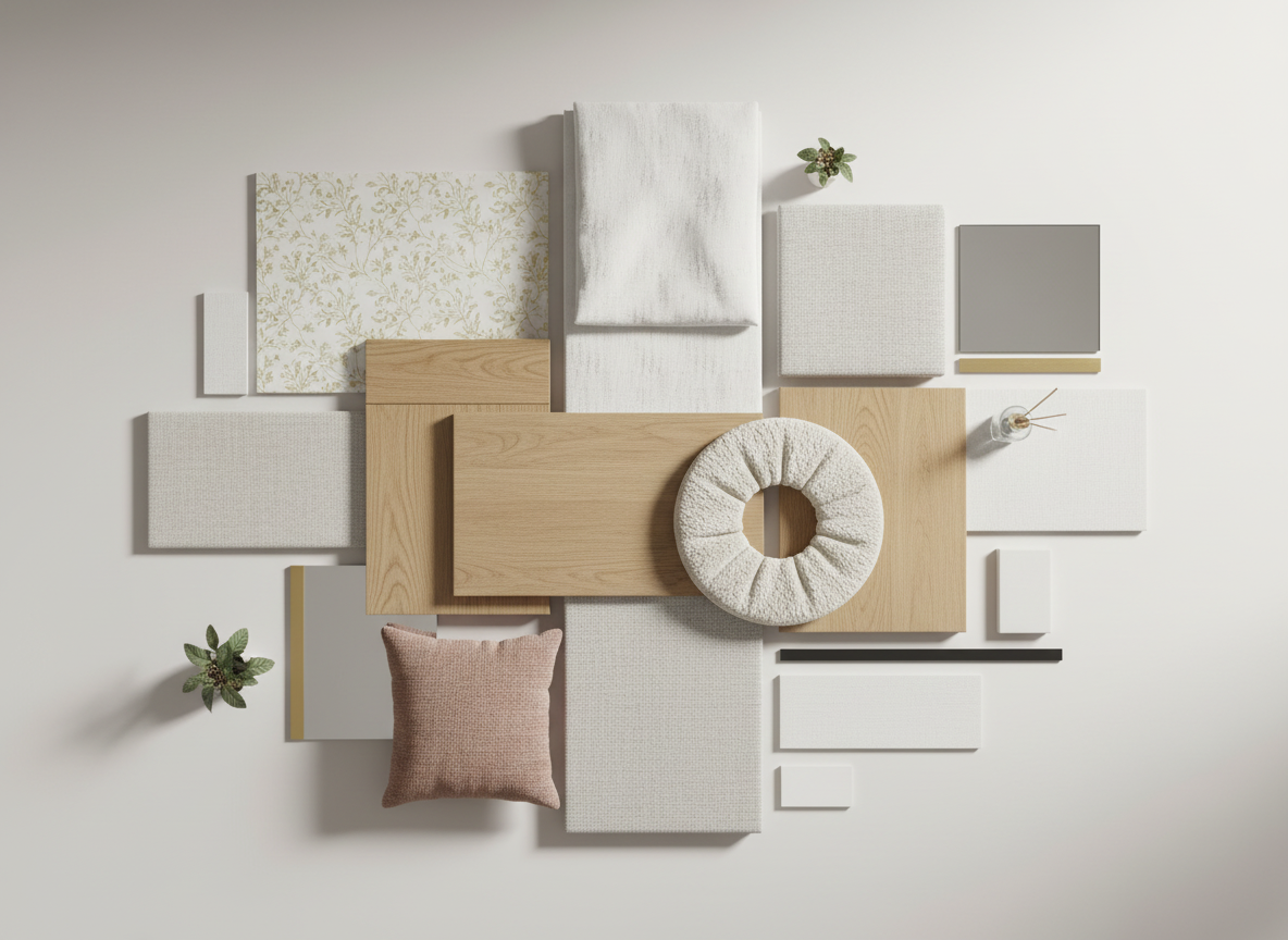 modern cozy bedroom with a soft neutral color palette a cream colored textured accent wall features subtle elegant floral patterns the bedding is crisp white with light gray sheets and pillows exuding tranquility a wooden dressing table with a light brown finish sits against the wall adorned with small decorative items like vases and reed diffusers in earthy tones a soft beige ottoman complements the warm natural atmosphere of the room the room is bathed in natural light from a large window casting gentle shadows and creating a peaceful inviting atmosphere the overall ambiance is warm and serene with an emphasis on comfort and relaxation quiero el mobiliario ademas de las muestras separa el tocador con espejo mesilla cama cojines lampara colgante ten en cuenta que la mesilla solova en el lado derecho de la cama y tiene dos cajones elimina la de la izquierda