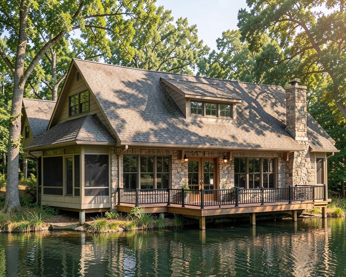 lodge style on a lake with mature trees cedar siding stone chimney screened in porch on left side deck with black railing on front
