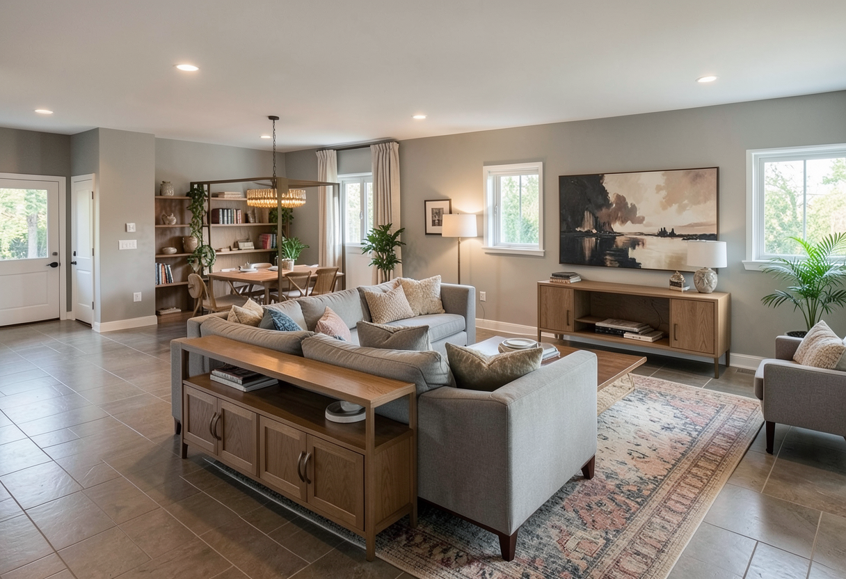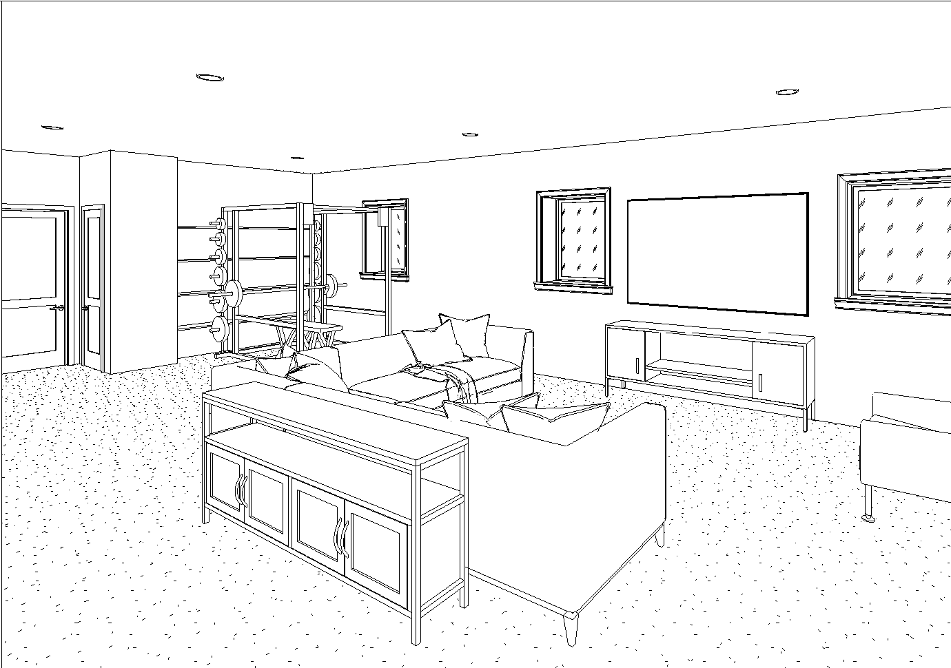 living room with comfortable transitional seating style there s a weight lifting rack and bench in the background and a doors to a linen closet and bedroom in the background behind the weight rack is a bookshelf that should be styled with books and decorative objects