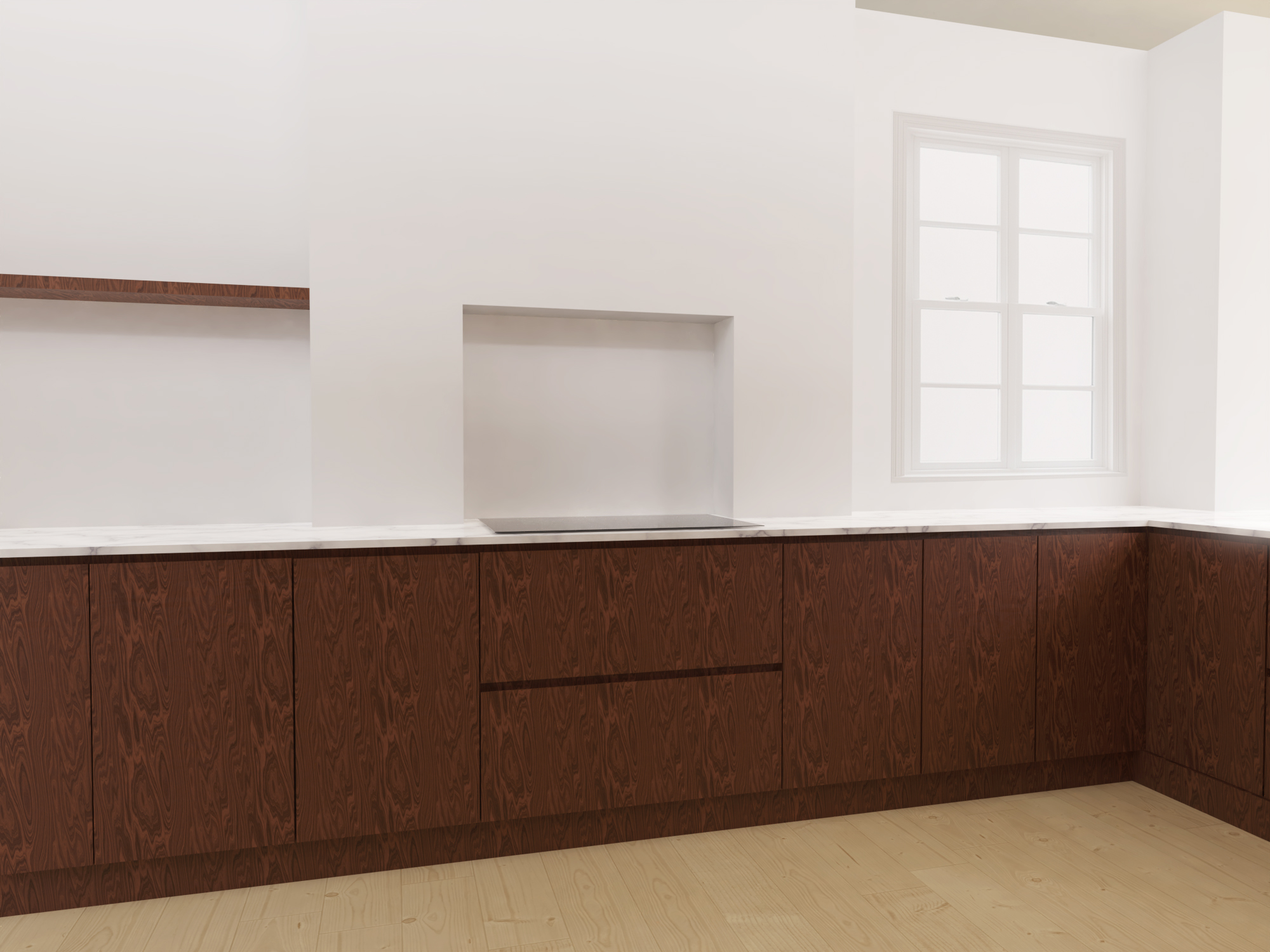 a walnut kitchen with marble counters and splashback and a mid oak floor add a few contemporary kitchen items to the shelves