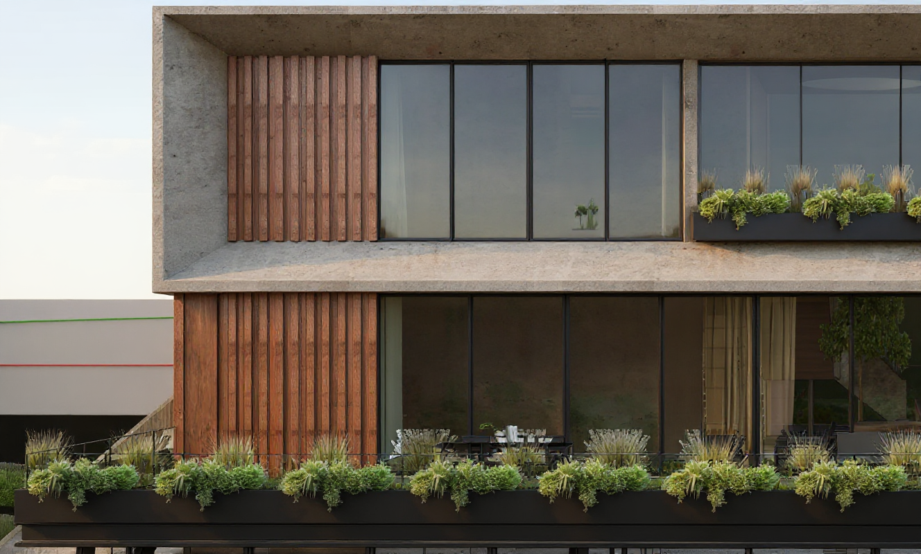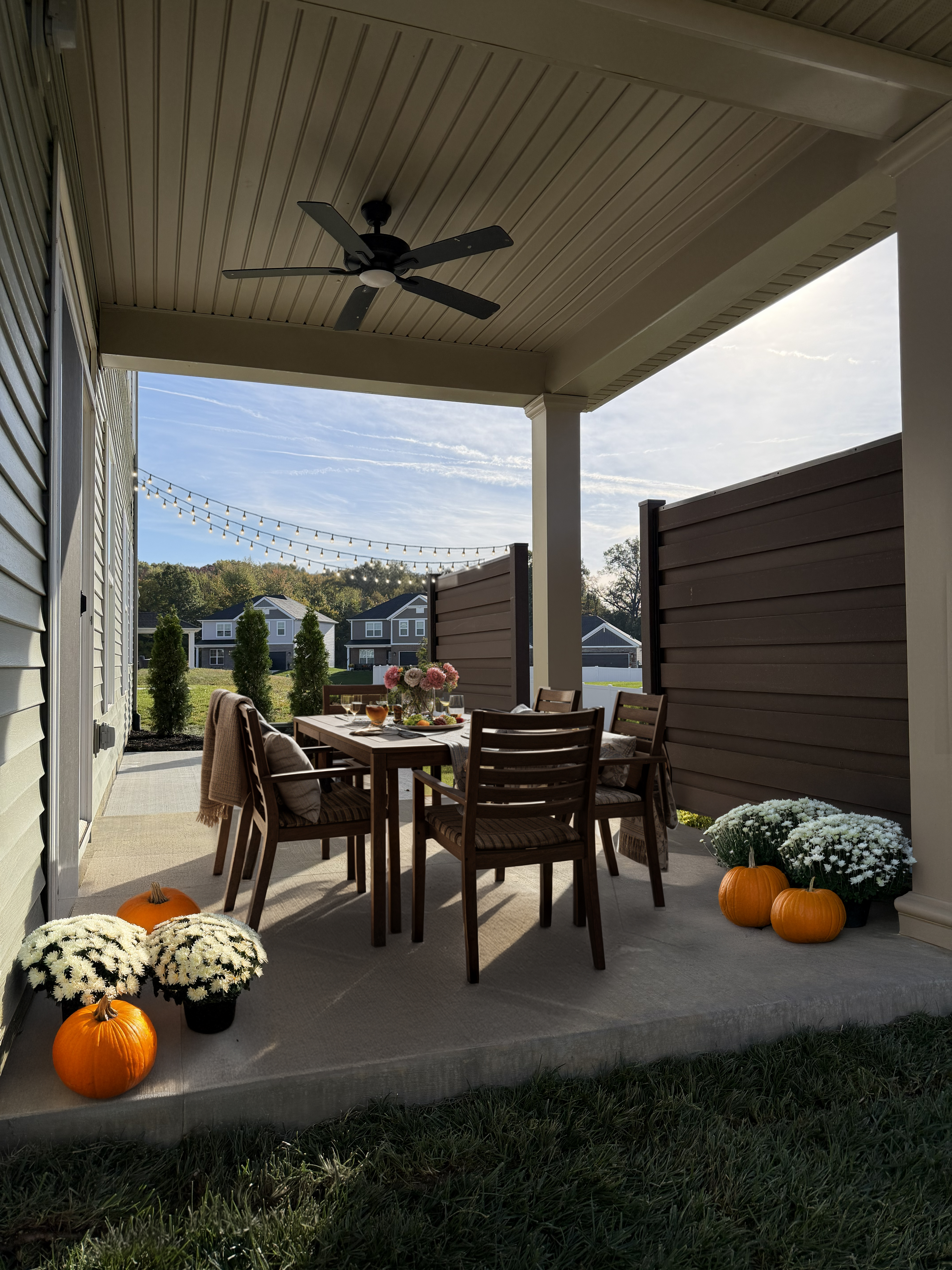 make the image look like a late fall evening adjust only the sky and overall lighting to create a warm golden hour atmosphere with soft fading daylight do not change or add any other details the home patio and landscape must remain exactly the same