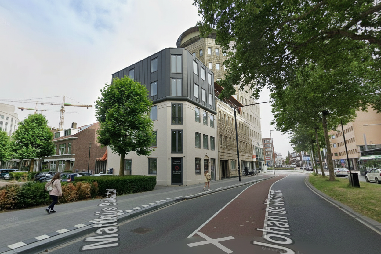 renovation and architectural completion of an existing building the current white building with a black upper extension serves as the starting point for a renewed architectural expression the overall volume and massing remain unchanged and the location and dimensions of all window and frame openings stay the same but the fa ade may be reinterpreted freely within these constraints develop a strong coherent fa ade concept that elevates the architectural quality identity and materiality of the building a distinct articulation between the lower and upper parts is encouraged but the exact manner of this division is open to interpretation through material transitions depth rhythm shadow lines or detailing contemporary high quality fa ade materials may be combined or contrasted such as brick concrete metal timber or refined mineral finishes with freedom in layering texture and detailing to create architectural depth and character the horizontal division between the two parts may be positioned slightly higher allowing the existing gutter line to run continuously around the building just above the existing white volume and to become an integrated architectural element the yellow building in the background is outside the scope of the project and must remain fully unchanged high quality realistic architectural visualization daylight conditions neutral sky urban context clear material expression and a clean professional presentation bottompart off white plaster top part in zinc standing seam allow the zinc flashing strips to extend downwards in vertical elements as well this allows you to connect some window frames to the raised volume