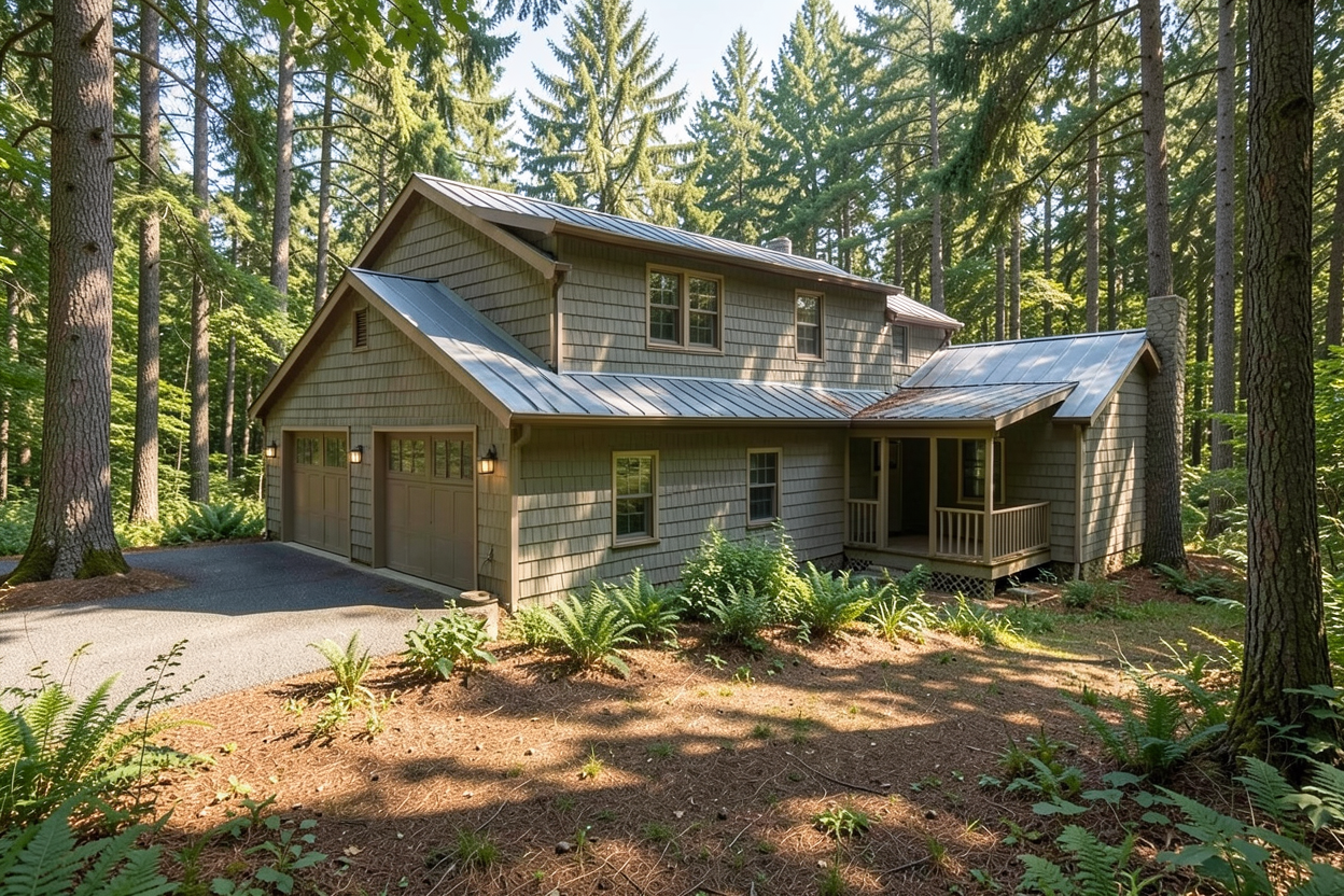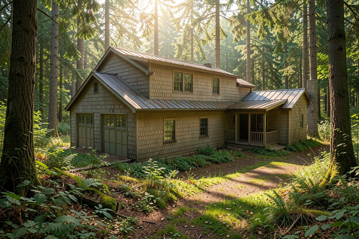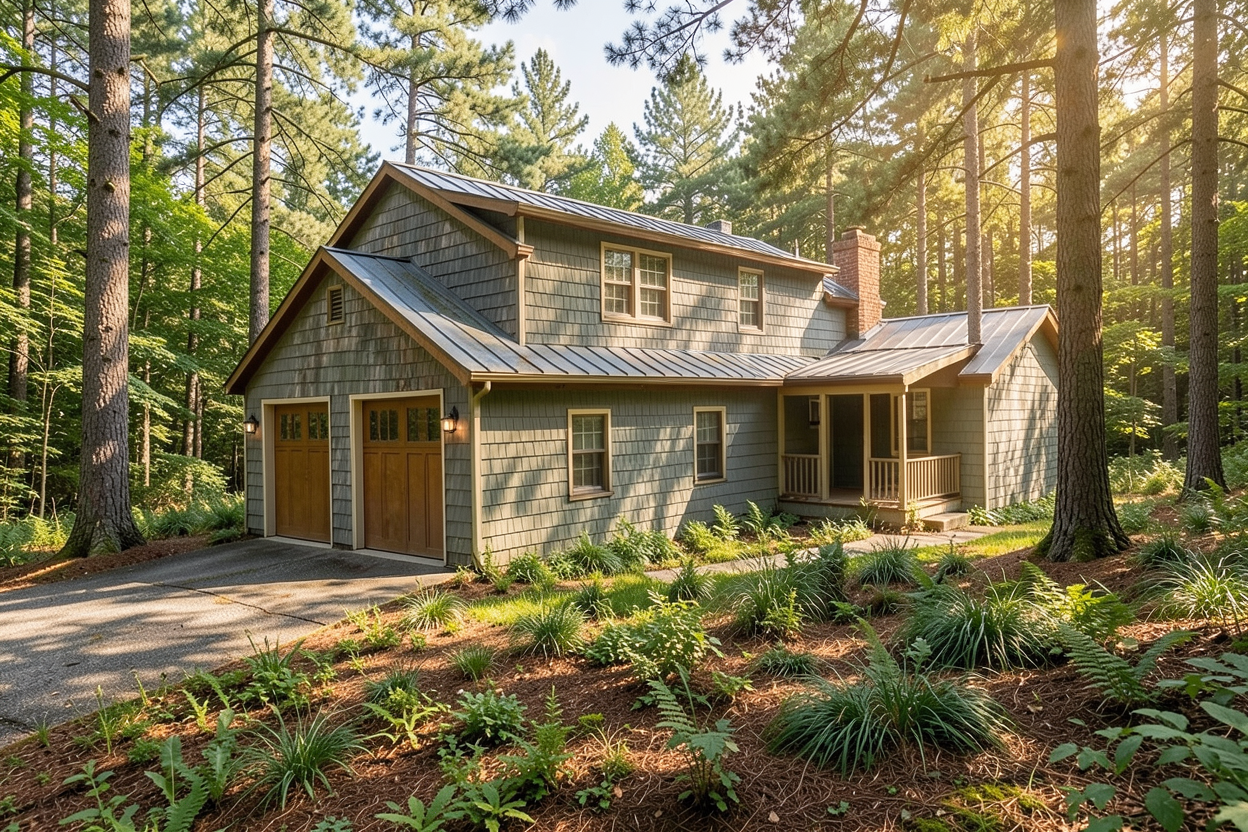 set in a forest remove the two big trees in front of picture remove big tree far left of picture add driveway to garage doors add walkway to porch remove tree from house driveway needs to slope uphill slightly