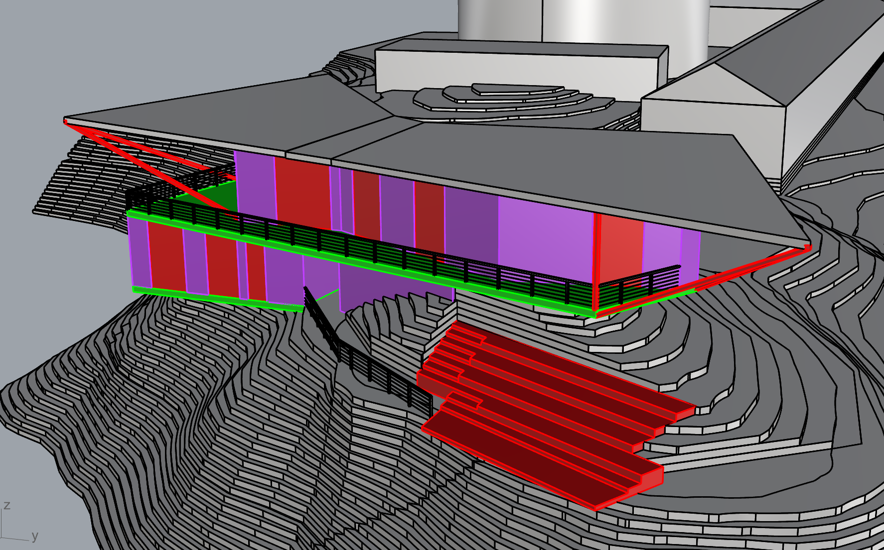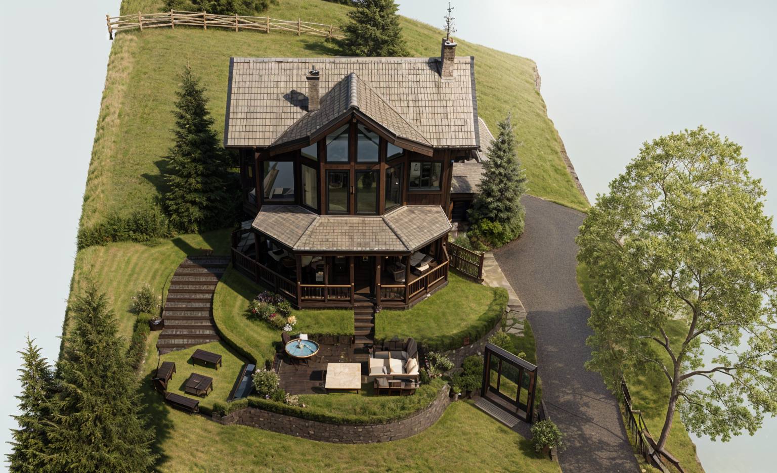 setting is on a mountain with a lot of trees and an open view to the sky smoothen the topography and exagerate the cliff add trees