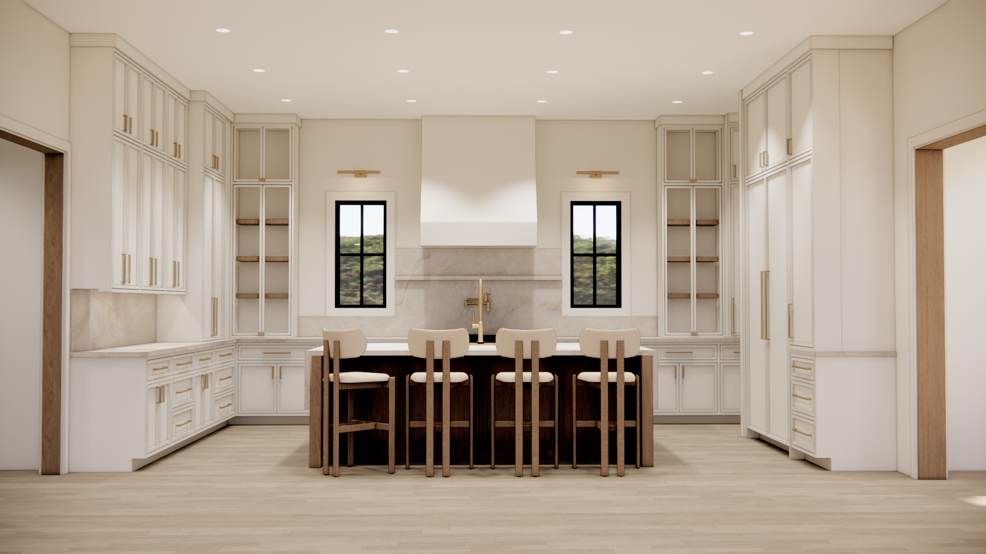 convert this architectural rendering into a highly realistic editorial style luxury real estate photograph suitable for marketing and listing imagery maintain the exact architecture layout geometry cabinetry layout window placement and proportions exactly as modeled do not redesign restyle or modify the architecture or cabinetry do not move or adjust cabinets appliances islands windows or walls enhance realism only through natural lighting accurate material texture subtle reflections and soft shadow depth the image should feel like a professionally photographed architectural digest style interior used for luxury real estate marketing materials in the space include builddirect engineered wide plank flooring in seashore finish walls and ceiling painted origami white by sherwin williams cabinetry featuring a combination of white painted cabinets and natural stained wood cabinets countertops and backsplash in taj mahal quartzite with soft slightly warm tones the wood flooring should show authentic grain correct plank scale subtle tonal variation and a natural matte sheen the natural stained wood cabinetry should show realistic wood grain depth natural variation and refined craftsmanship white cabinetry should appear clean crisp and softly illuminated with natural shadow lines at the doors and panel details the taj mahal quartzite counters and backsplash should appear natural and refined with soft movement and subtle warm tonal variation not overly glossy or artificial natural light should be softly entering through the windows in an editorial architectural photography style creating gentle highlights natural interior bounce light and subtle shadow depth throughout the space the furniture and decor shown in the rendering should be treated as placeholders and replaced with high end restoration hardware and pottery barn style staging elements appropriate for a luxury kitchen inside the glass upper cabinets add very minimal restoration hardware style styling only a few carefully placed objects should be visible such as a small stack of neutral ceramic plates a few simple glassware pieces one refined serving object the glass cabinets should remain mostly open and uncluttered maintaining a clean high end appearance add subtle kitchen staging elements such as a neutral stone or ceramic bowl a refined serving tray or board a small stack of curated cookbooks all staging should remain restrained and minimal so the architecture and cabinetry remain the focus the final image should appear highly realistic refined and editorial similar to a luxury architectural digest feature or professionally photographed high end listing do not alter architecture cabinetry layout appliances materials geometry or design only enhance realism and staging