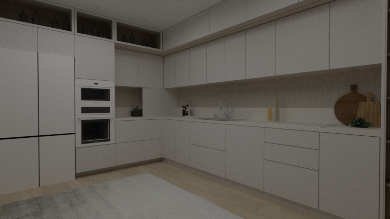 it has natural light and ceiling spotlights led lights under the two level cooking area and led lights on the shelves with glass