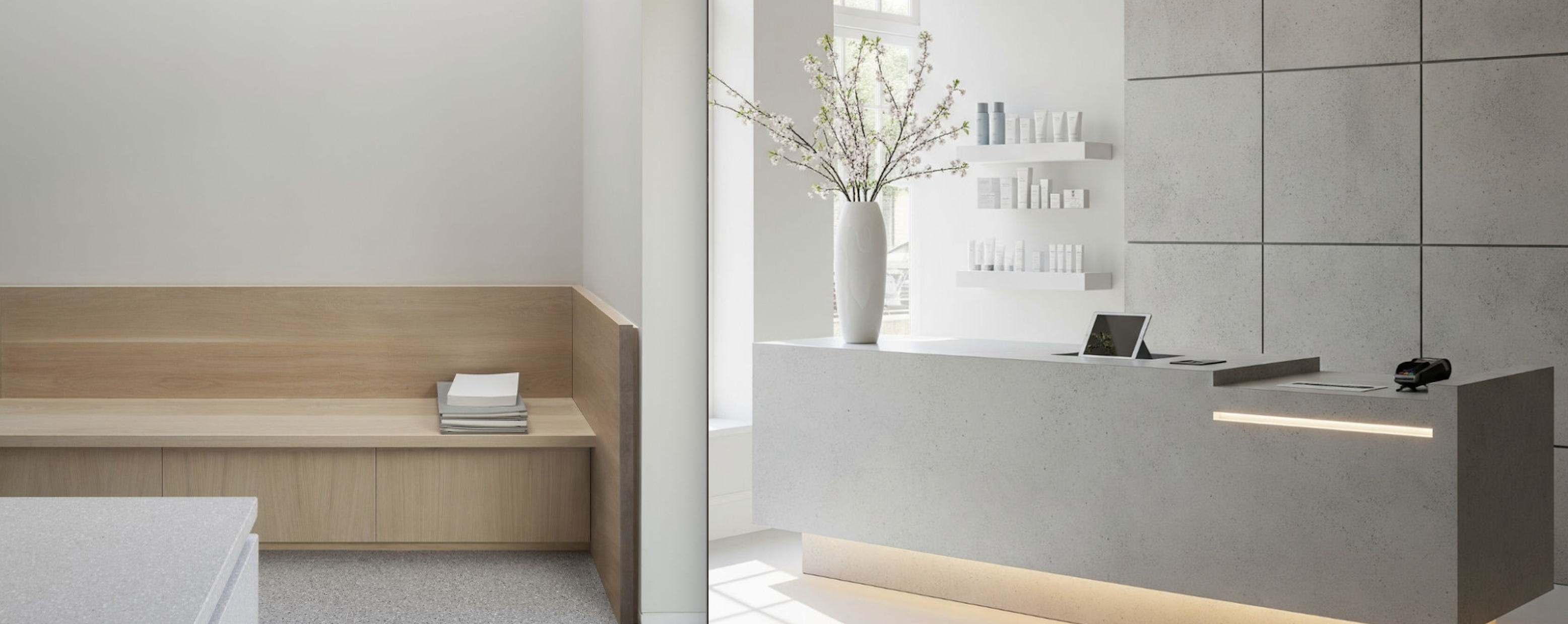 exterior shot use the raw perspective image as the strict composition geometry facade window layout entrance position and camera reference preserve the exact viewpoint proportions glazing wall positions and overall architectural structure of the raw perspective use the seating reference image only as inspiration for the left side of the interior create a calm minimalist waiting area visible through the left window with a built in bench in light natural oak integrated along the wall with subtle storage below clean vertical divisions and a refined healthcare atmosphere keep it very minimal warm and architectural use the reception reference image only as inspiration for the right side of the interior create a minimalist reception area visible through the right window with a built in full height cabinet wall along the right interior wall and a compact reception desk placed in front of it both elements should follow the same design language as the waiting area using light oak millwork flush fronts clean lines and a light textured mineral or terrazzo like surface overall style contemporary minimalist healthcare interior calm bright refined understated soft daylight subtle warm interior lighting smooth off white to warm light grey plaster walls light fine grained terrazzo or mineral floor slim dark metal frames realistic materials soft shadows uncluttered composition do not redesign the architecture do not change the facade do not move windows or doors do not alter the camera angle only develop the interior atmosphere and built in furniture based on the reference images