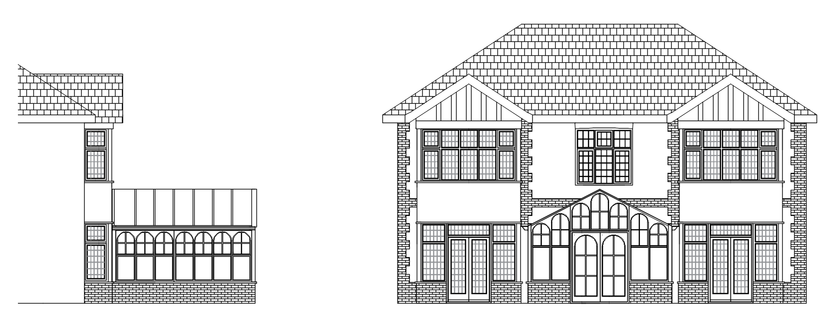 produce a 3d render the house has brown brick work where shown the rest is textured render painted white the windows are white with lead the conservatory is white with grey lead features to the roof there is decorative brickwork around as shown the roof tiles are a clay tile that are well weathered the gables have black timber work with textured white render in between the black timber the patio in the foreground is a grey porcelain slab door handles are black ironwork style cills the the windows and doors are painted black the guttering and fascia of the house is black the conservatory guttering is white