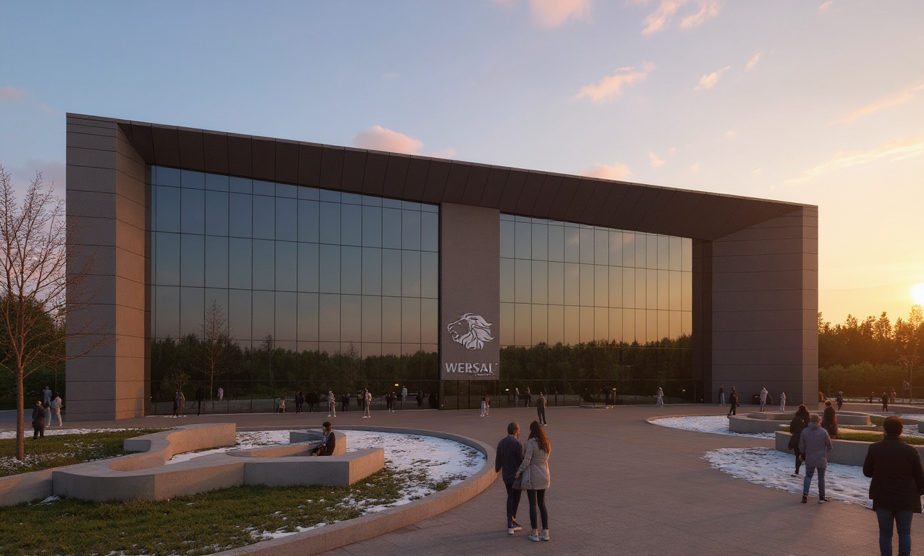 develop the area in front of the office building add concrete benches modern small architecture and decorative low greenery less grass more low ornamental greenery and a few trees modern style architectural concrete add people and ornamental trees winter view add more snow and people summer sunrise do not change the appearance of the building add a lot of people do not change the appearance of the building add a festive christmas atmosphere a square made of large concrete slabs with puddles after rain night view some of the higher floors are also illuminated the building has 4 floors render to get a mockup effect