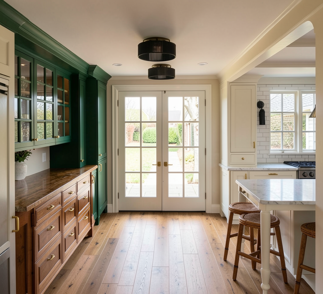 colorize so cabinet wall on left is dark dusty green with glass inserts brass hardware french doors are to exterior on the left the kitchen island on the right is walnut and the cabinets along the wall are off white floor is a medium brown 2 oak wood floor this is a view into a transitional traditional kitchen keep all elements the same