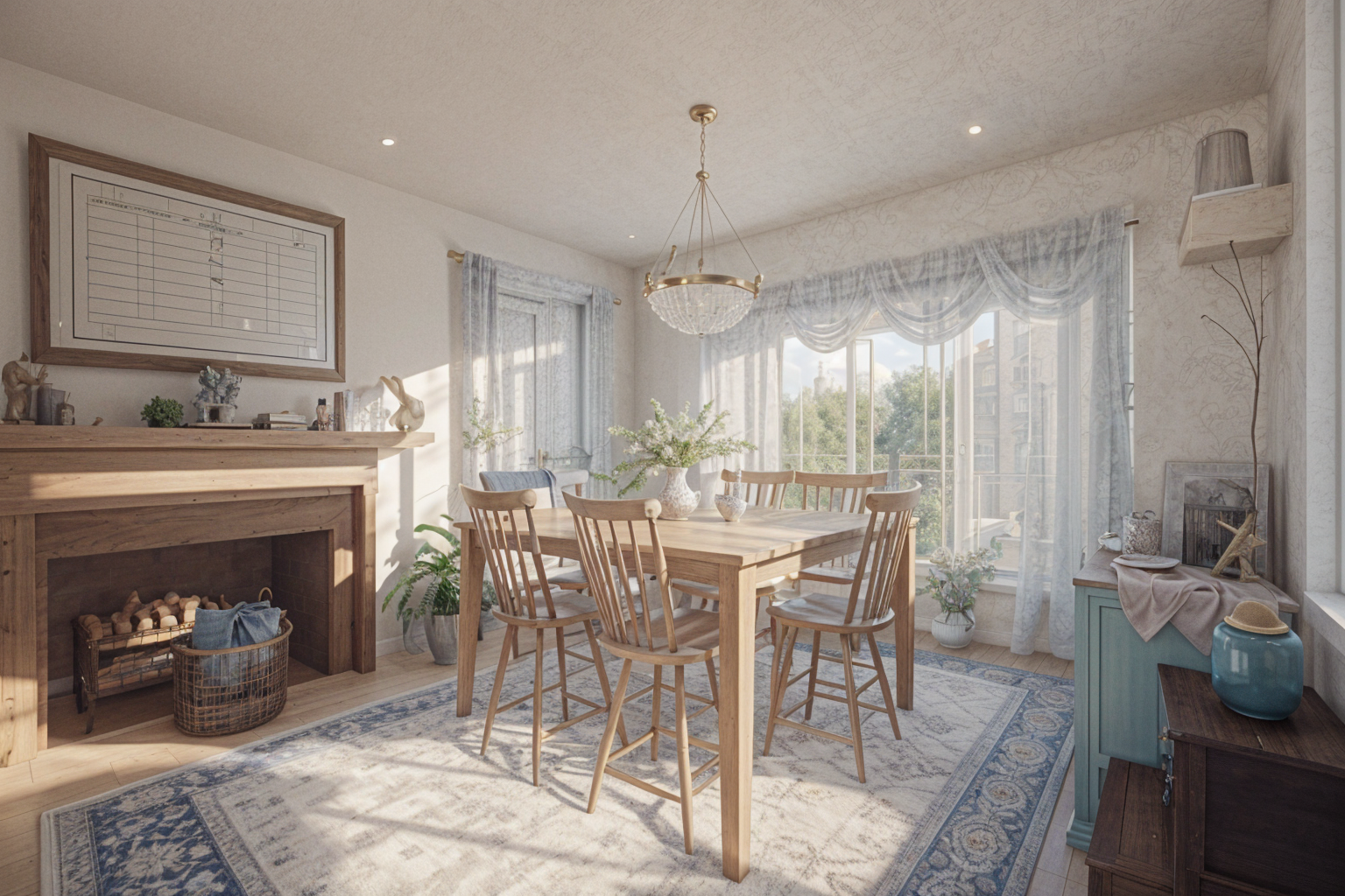interior elevation with rustic beams just over table old world dining table with chairs for 8 black round iron and crystal hanging chandelier great wine room with glass and iron doors creamy white tomes on walls natural wood floors overcated day
