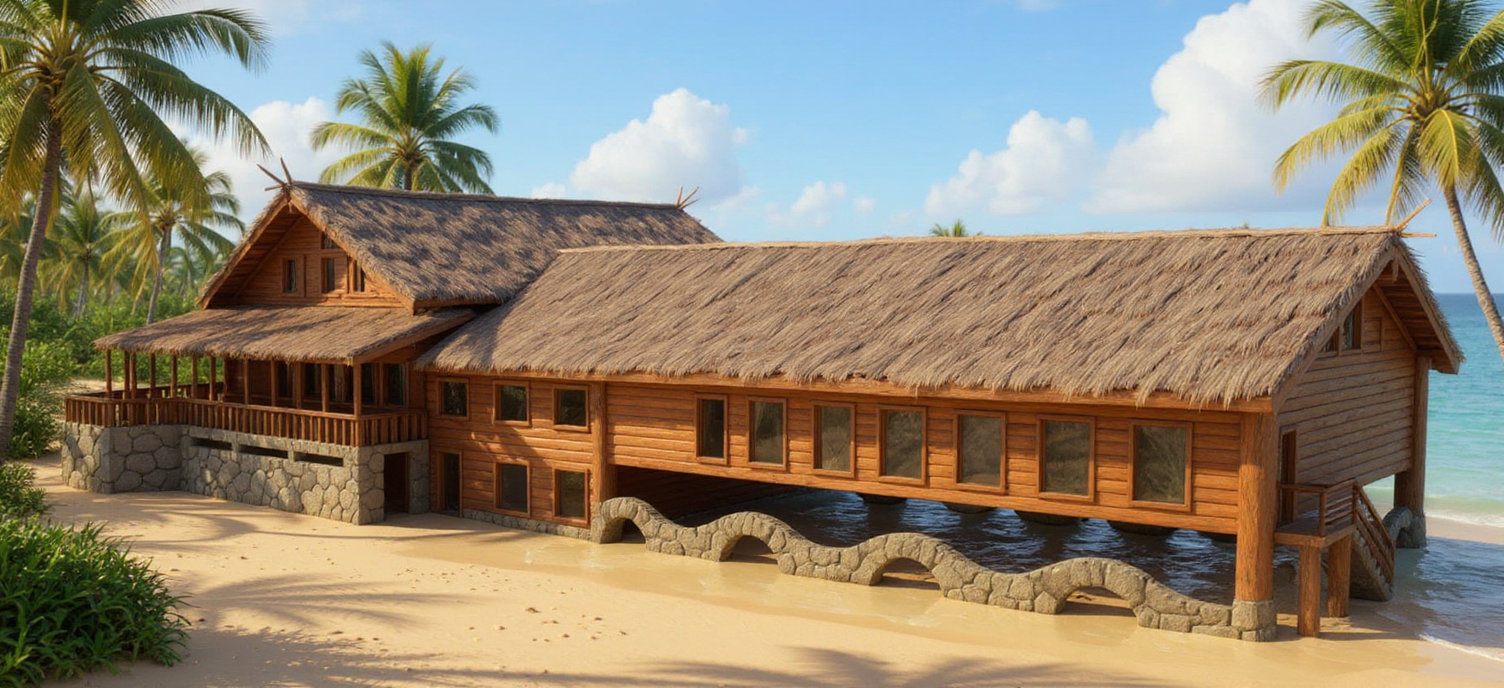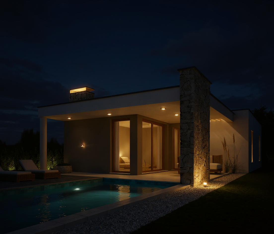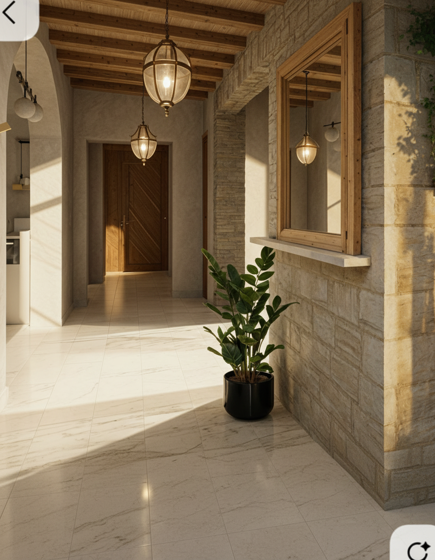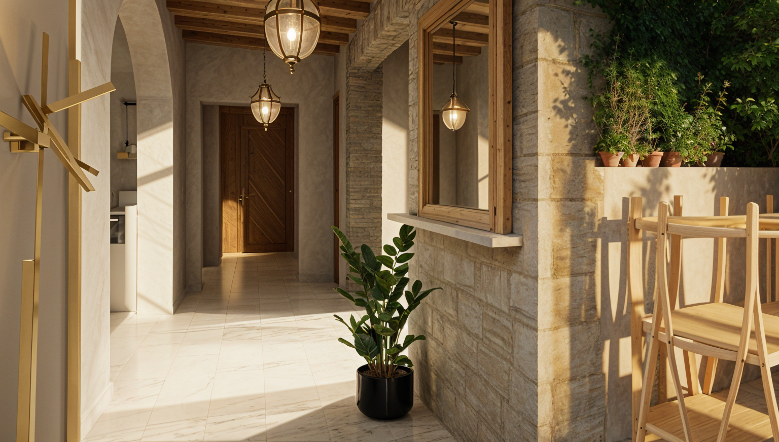 keep the same base geometry and layout do not change walls proportions or structure focus on the bar area make it more realistic warm and atmospheric add more plants especially hanging greenery falling from the ceiling place the olive tree inside a clay pot for a natural mediterranean look fill the shelves with bottles and glasses add small decorations and use soft warm lighting to create a cozy mood do not redesign or move anything only refine the bar area with more realistic materials lighting and mediterranean plants architecture