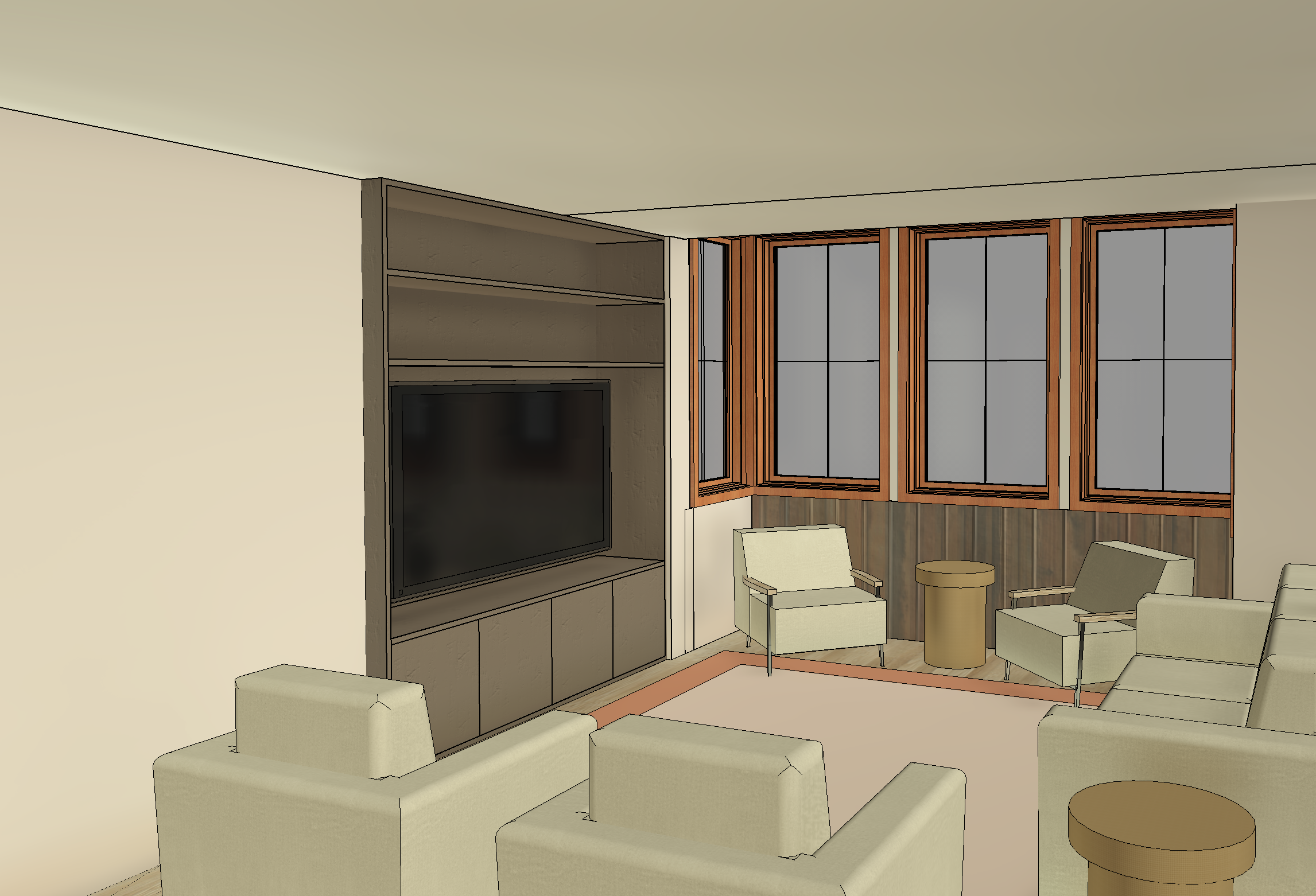comfy parlour looking out onto telluide trees and mountains veneer wood shelving tv casework