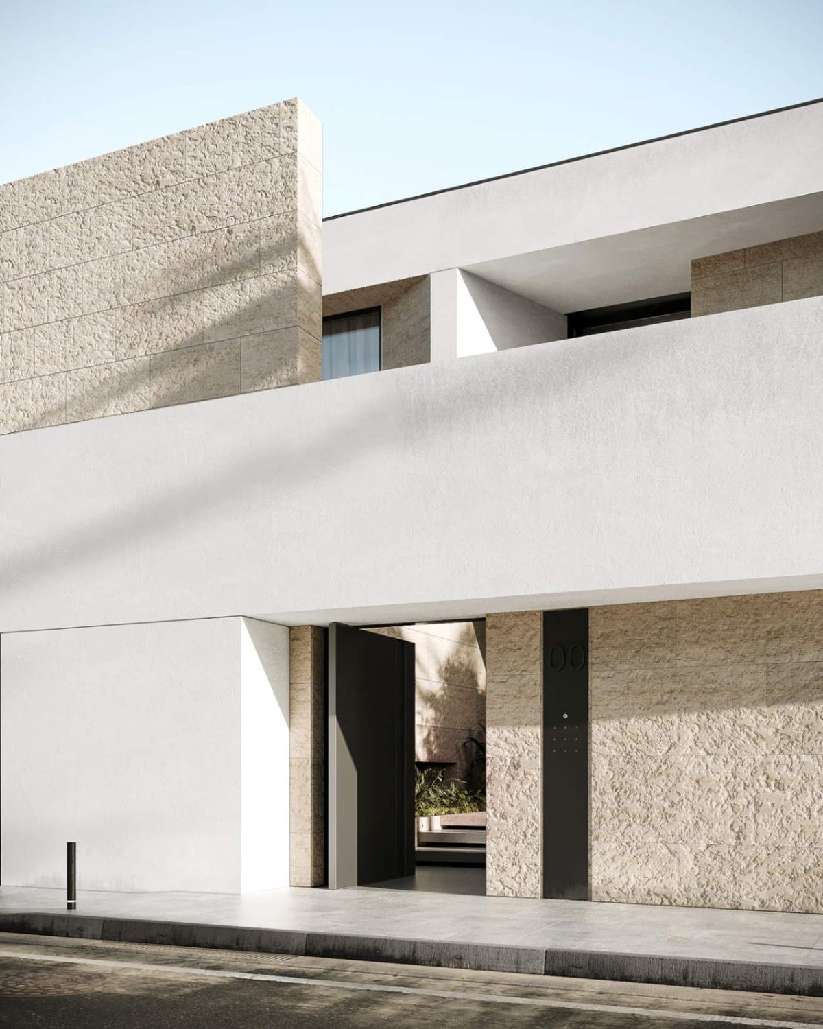 exterior shot make it with these material black stone white make it clean and the surrounding to be nature so the house hits on a hill