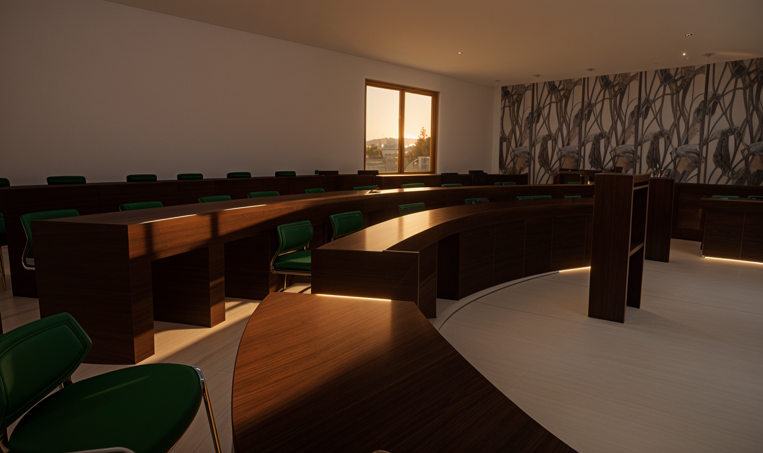 render a twisted skyscraper with a modern architectural design featuring seamless white and gray bands wrapped around the structure the glass windows reflect the sky showing a gradient of light blue to deep azure below lush green trees provide a natural contrast the atmosphere is serene and futuristic with a warm golden light from a setting sun casting gentle shadows creating a harmonious and captivating scene architecture