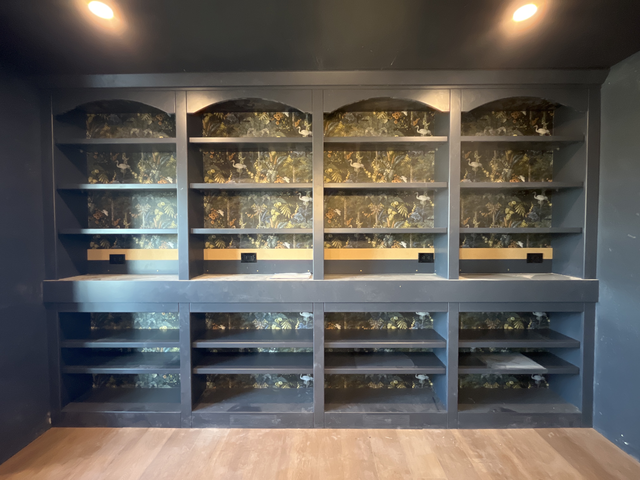 do not change the cabinets in any way preserve the exact cabinet colors materials finishes dimensions door and drawer styles hardware spacing alignment and all geometry exactly as shown do not alter the countertop shape backsplash appliances flooring lighting fixtures or wall structure only remove the construction materials clutter and mess from the scene clean the room and make it look finished and staged add a few simple tasteful home accessories appropriate for the style of the space but do not add or remove any furniture windows or architectural elements maintain the original lighting direction and realism enhance clarity and polish the photo while keeping the cabinetry and room design completely unchanged do not alter the lighting to keep the cabinet colors as they are in the image stage for a beautiful library