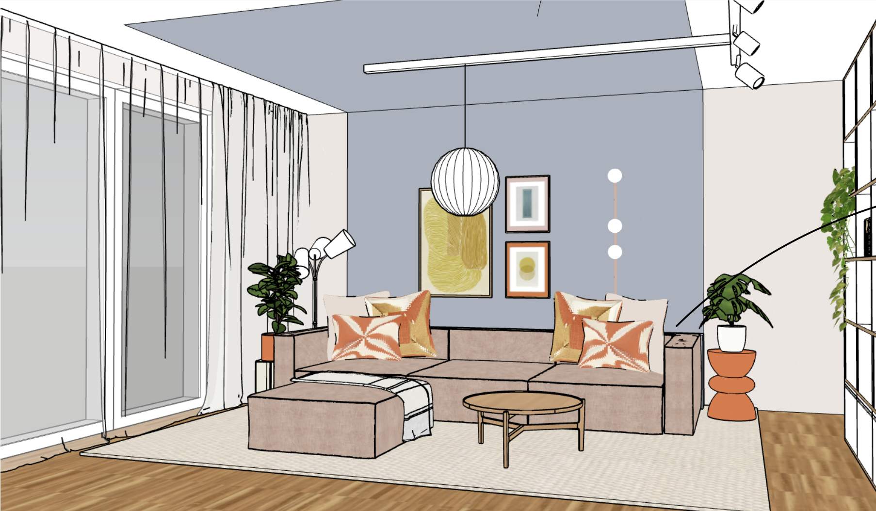 blue wall behind the sofa and on the ceiling sofa and a light pink sofa pillows in orange
