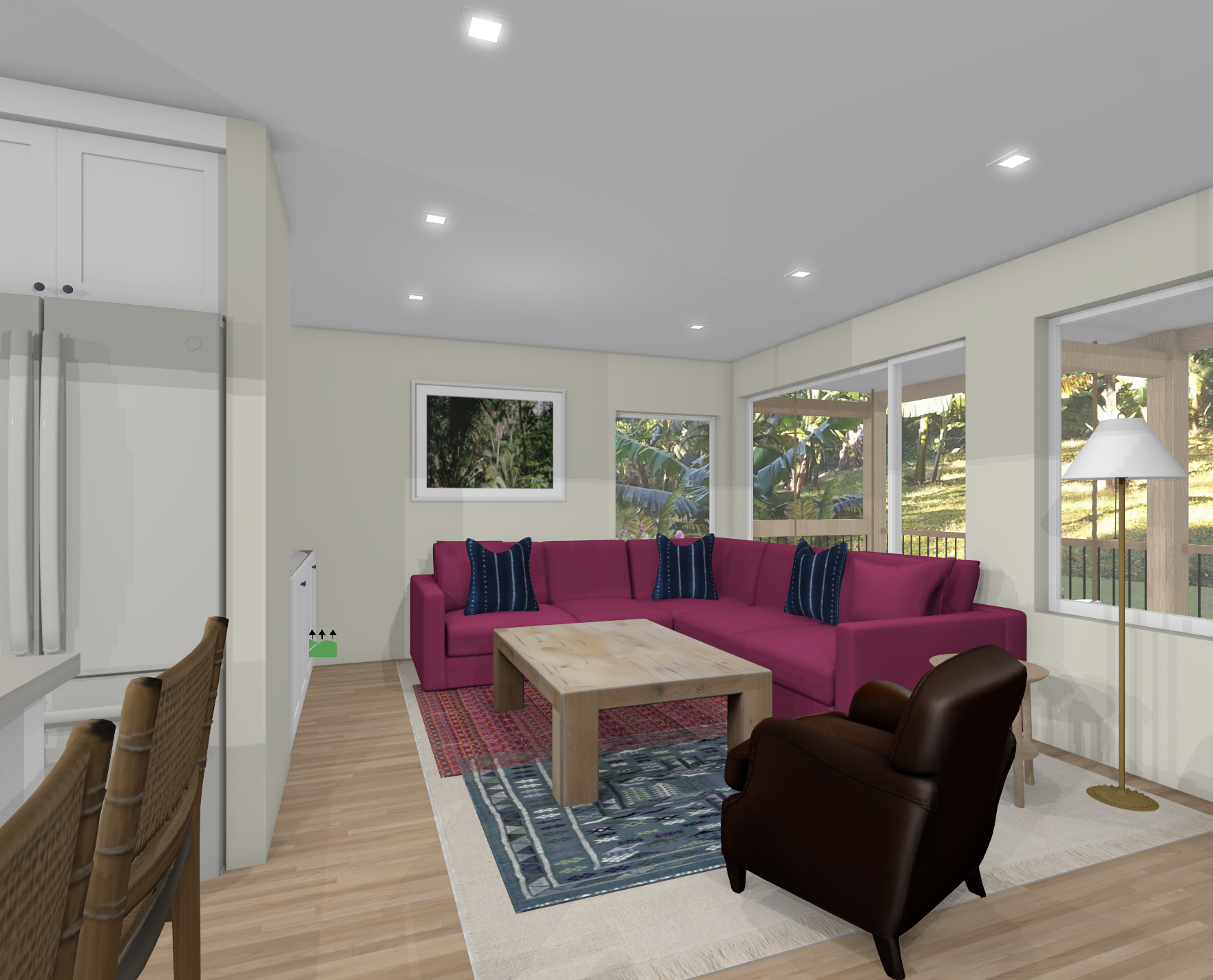 create a photorealistic image of this bohemian style living room with soft warm lighting at sunset