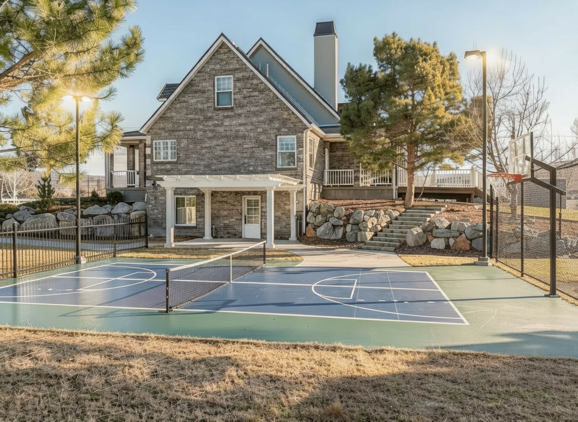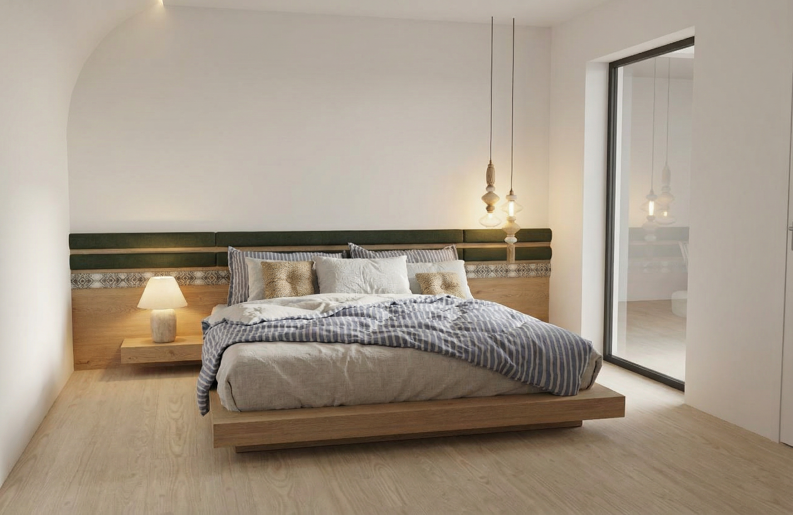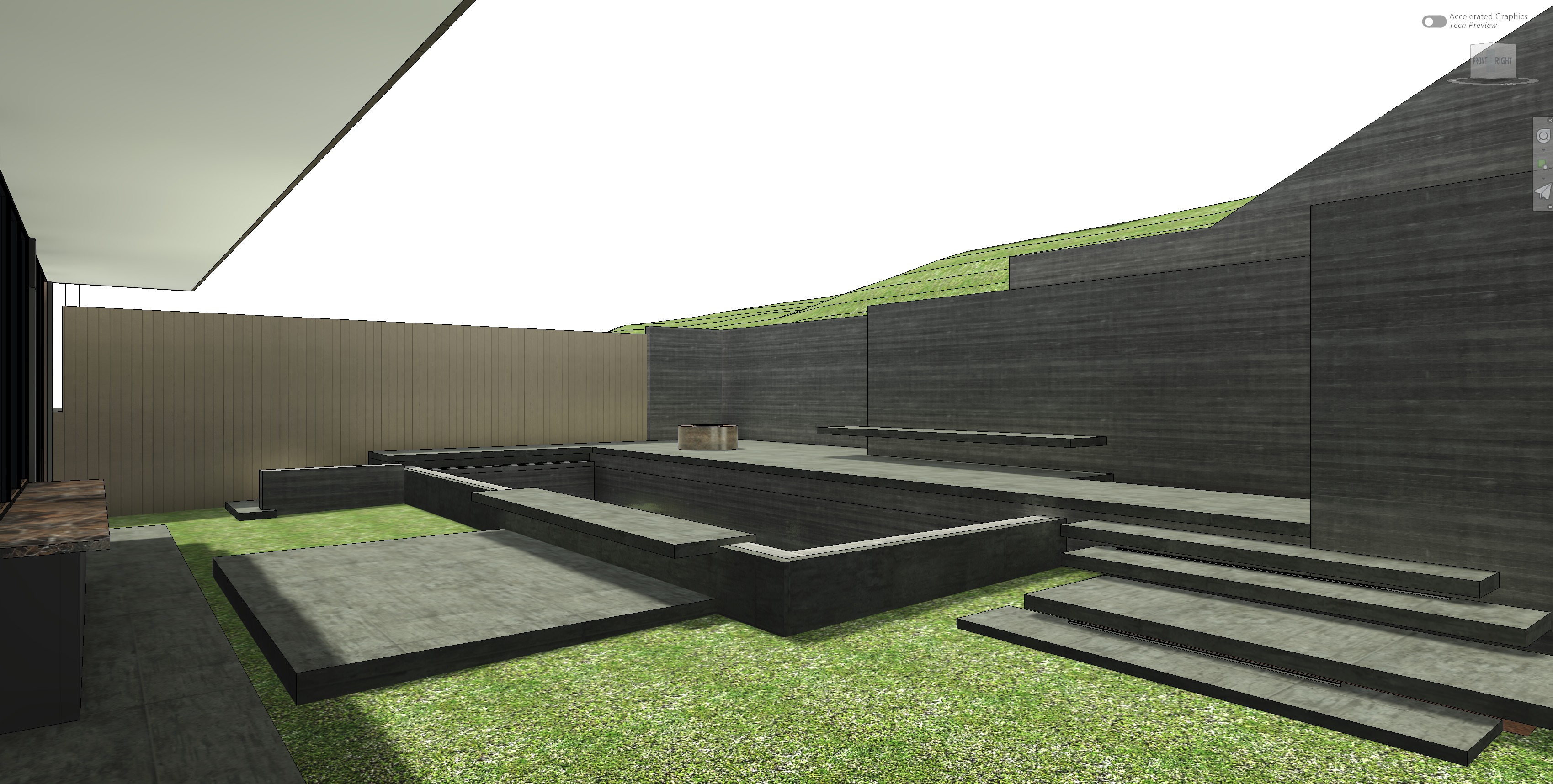 photo realistic rendering no changes to the structural or architectural elements scene is an afternoon pool gathering add a group of attractive men socializing and swimming with one or two women sitting on the benches add lush forested landscape to the hill behind the retaining walls at the top of the retaining walls add low rounded trim bushes and aloe veras in the yard add lush mediterranean planting along the fence add creeping vines on the fence which is wood vertical slats all vertical concrete surfaces to be vertical 4 inch board formed black concrete horizontal concrete surfaces to be smooth black cast in place concrete