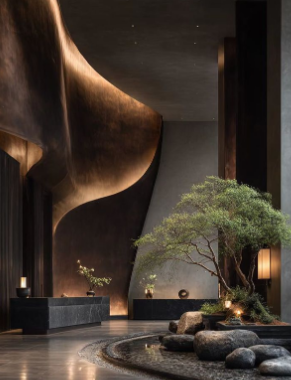 generate a photorealistic interior of a modern luxury residence designed to match the exterior architecture and style the space should feel dark sophisticated and opulent using a palette of deep tones like charcoal black dark wood and rich metallic accents include modern furniture clean lines layered textures and subtle ambient lighting that enhances the luxurious mood ensure the interior layout feels realistic and coherent with the exterior view showing depth shadows and natural light from windows where appropriate reflect attention to high end details materials and finishes emphasizing elegance and contemporary design