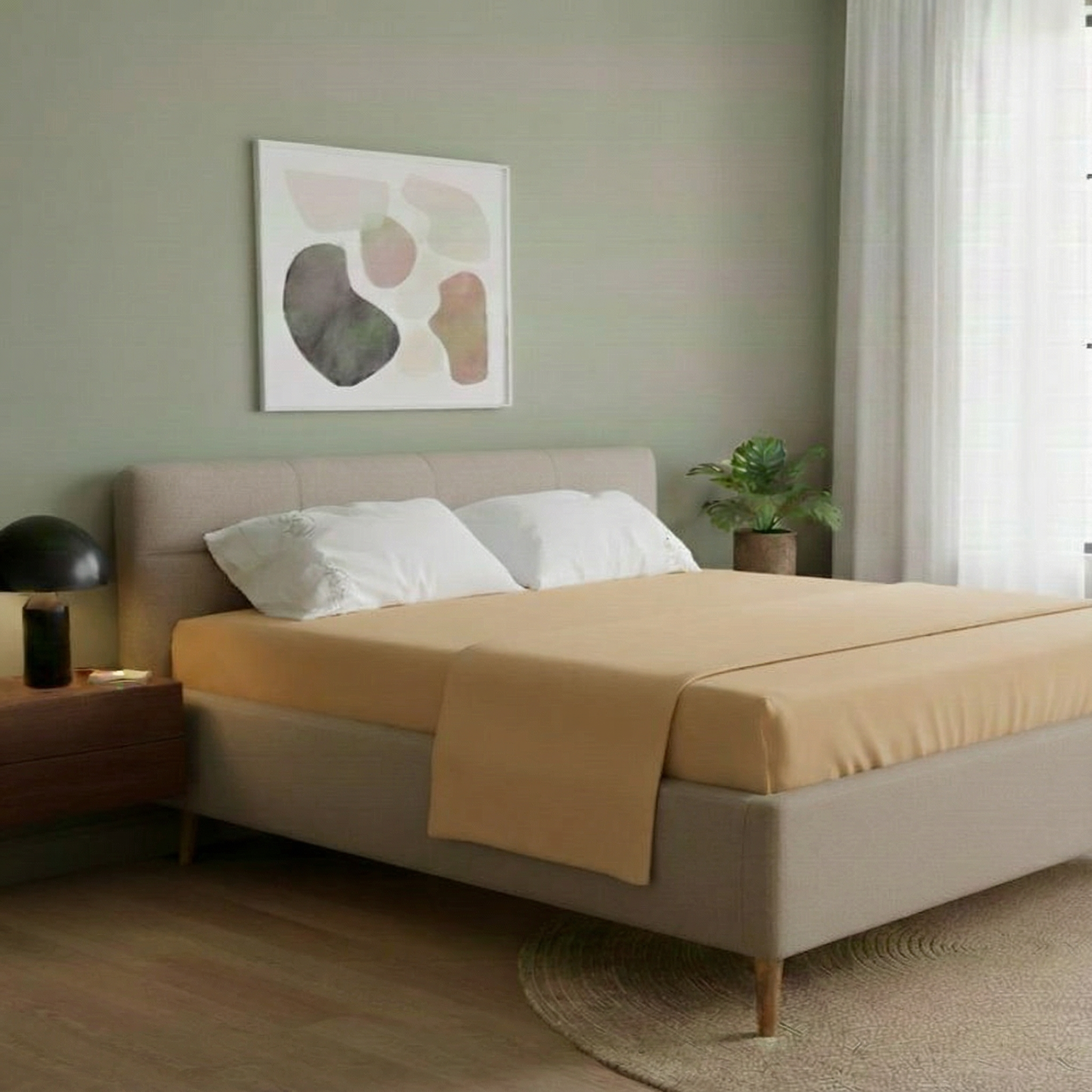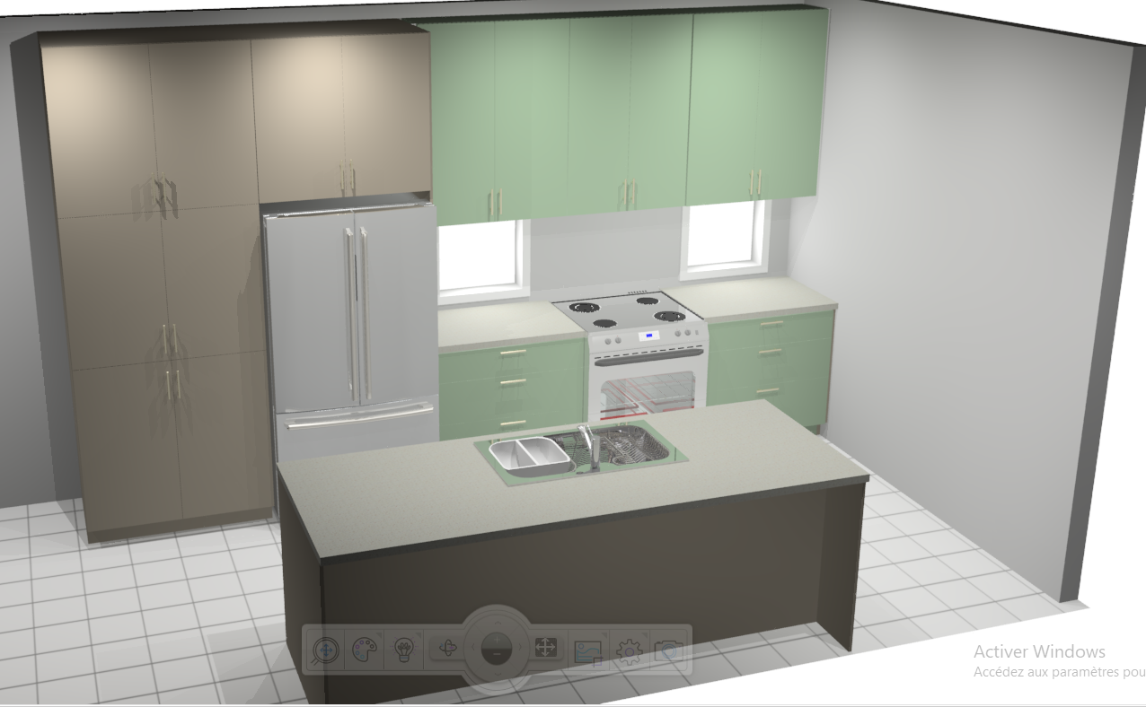 create a modern kitchen interior with mint green upper and lower cabinets accented by gold handles the tall pantry cabinet is a warm taupe color include a sleek stainless steel refrigerator and oven the countertops are a light beige with a subtle texture the walls are painted in a soft neutral gray providing a calming backdrop the flooring is white tiled reflecting light softly the overall atmosphere is bright fresh and inviting use natural lighting coming through the windows to enhance the cheerful ambiance