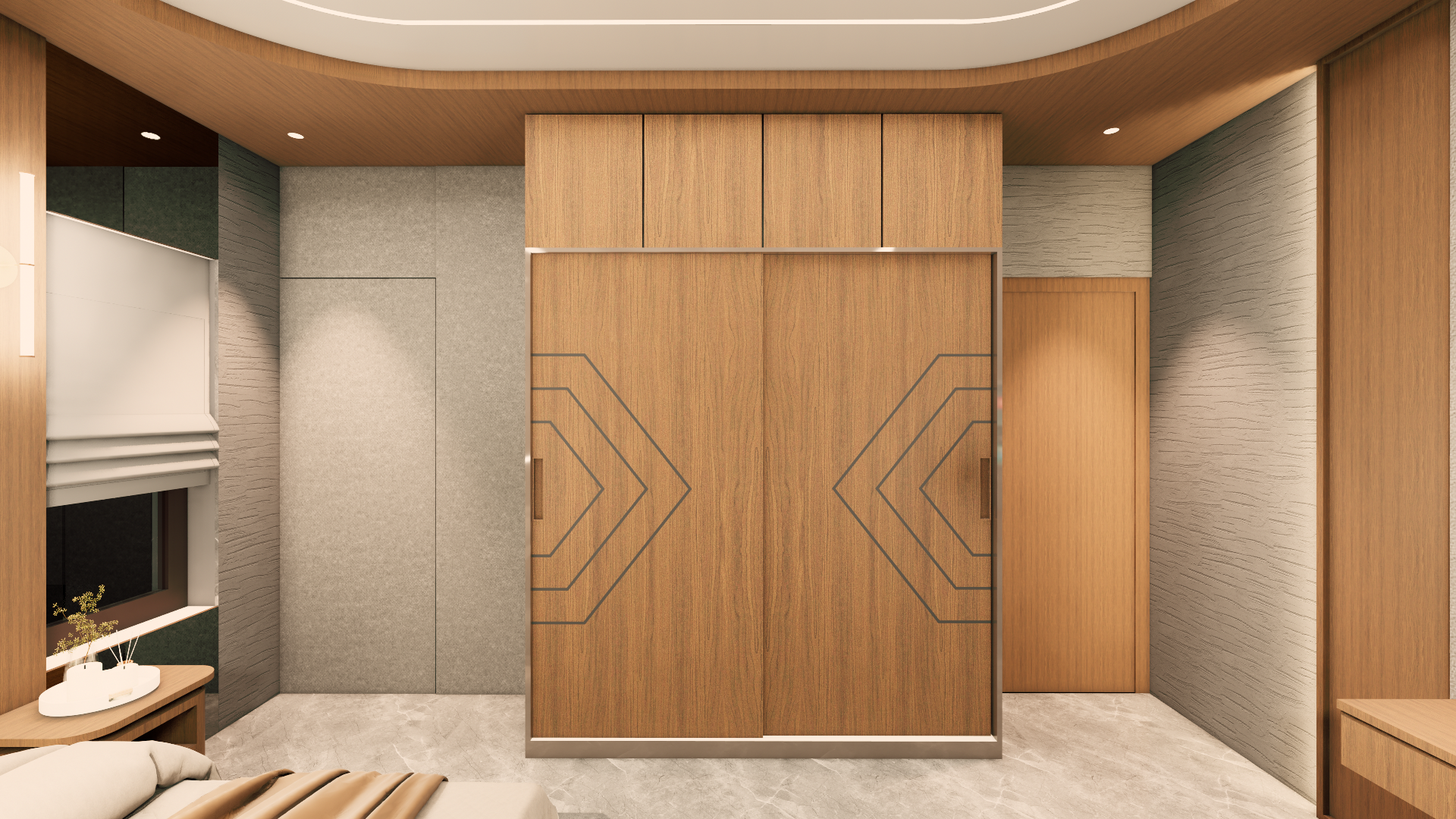 make changes in colors if required to the room with the color pallete walnut wood medium and dark grey beige and brass metal and let the room look dark but cozy and make it look realistic
