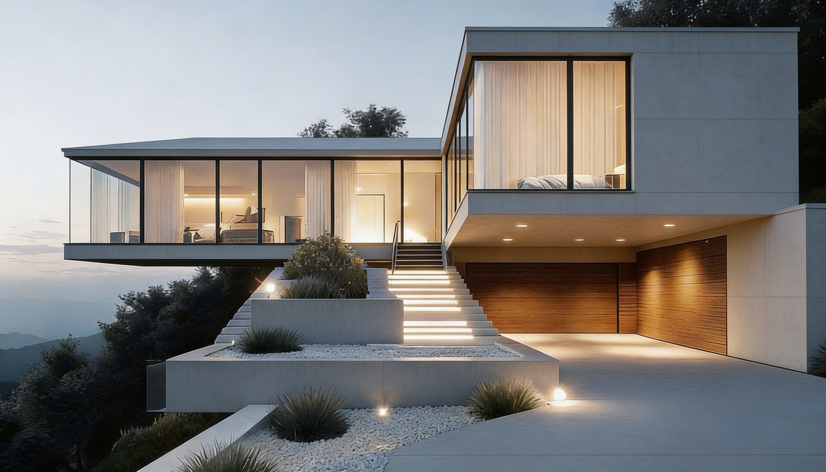 render a modern interior architectural space with high ceilings and large windows use soft beige for the walls and a warm light gray for the floor the window frames should be a sleek dark gray illuminate the scene with natural daylight streaming through the windows creating a bright and inviting atmosphere add subtle reflections to the glass and a hint of greenery outside enhancing the serene and open feeling of the space