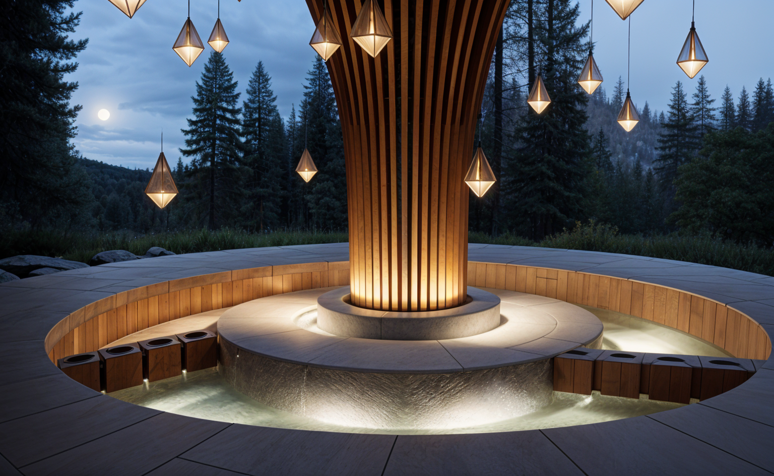 modernist night shot wooden main structure with light glowing from the inside hanging glass pieces with light water and stepping stones background of yosemite park architecture