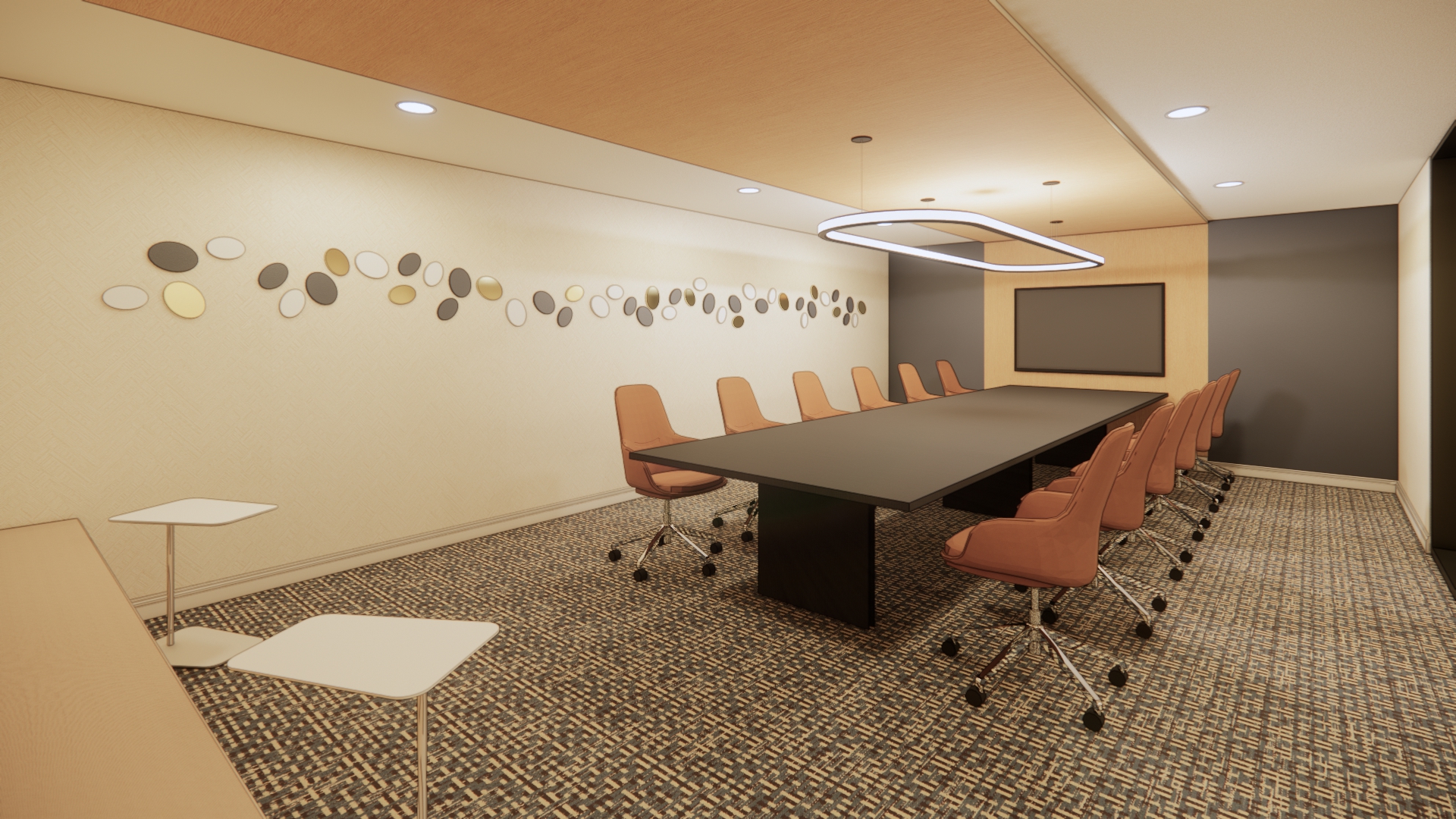 add metal ribbon art on the left wall add conference room accessories and people