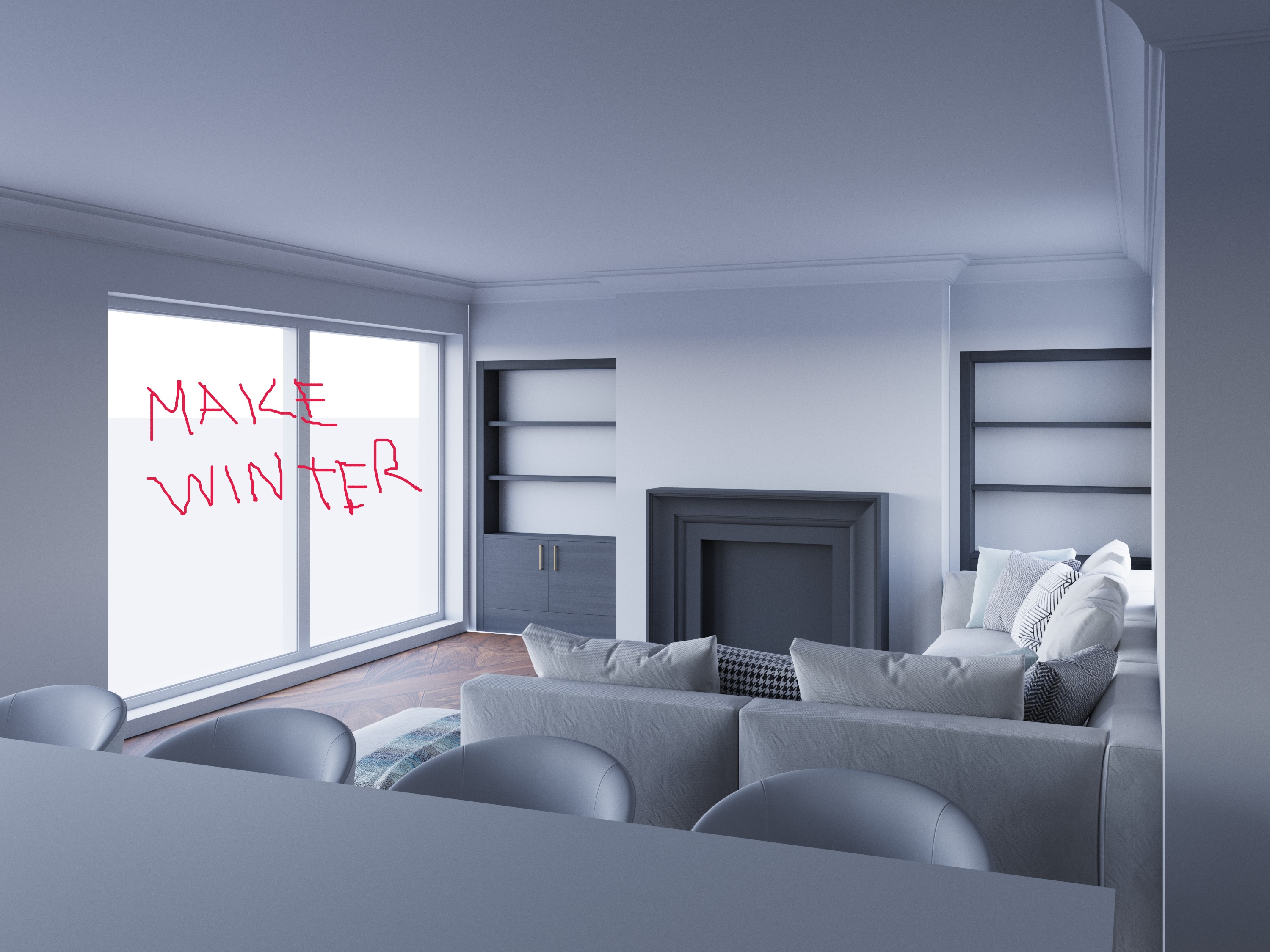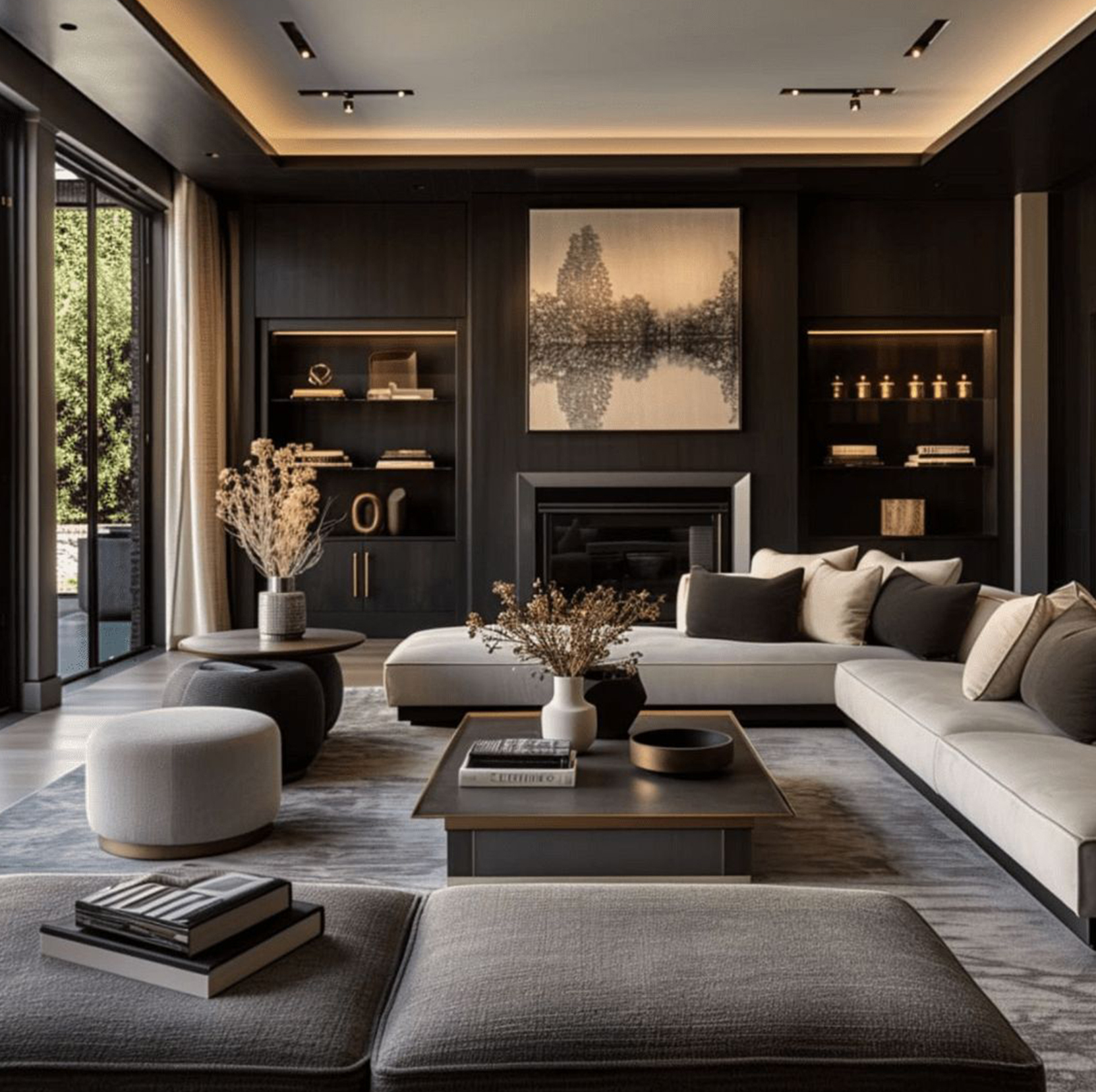 exterior shot render a contemporary living room with a calming atmosphere use soft neutral tones for the walls and ceiling such as light grey the large windows should allow natural light to flood the room casting subtle shadows the sofa is a plush creamy white with a variety of decorative cushions in grey pastel mint and soft white the fireplace should be a deep charcoal grey adding depth the shelves flanking the fireplace are a sleek dark grey the wooden floor features a warm medium brown finish with subtle grain patterns add a minimalist aesthetic with smooth matte surfaces creating a serene and inviting environment