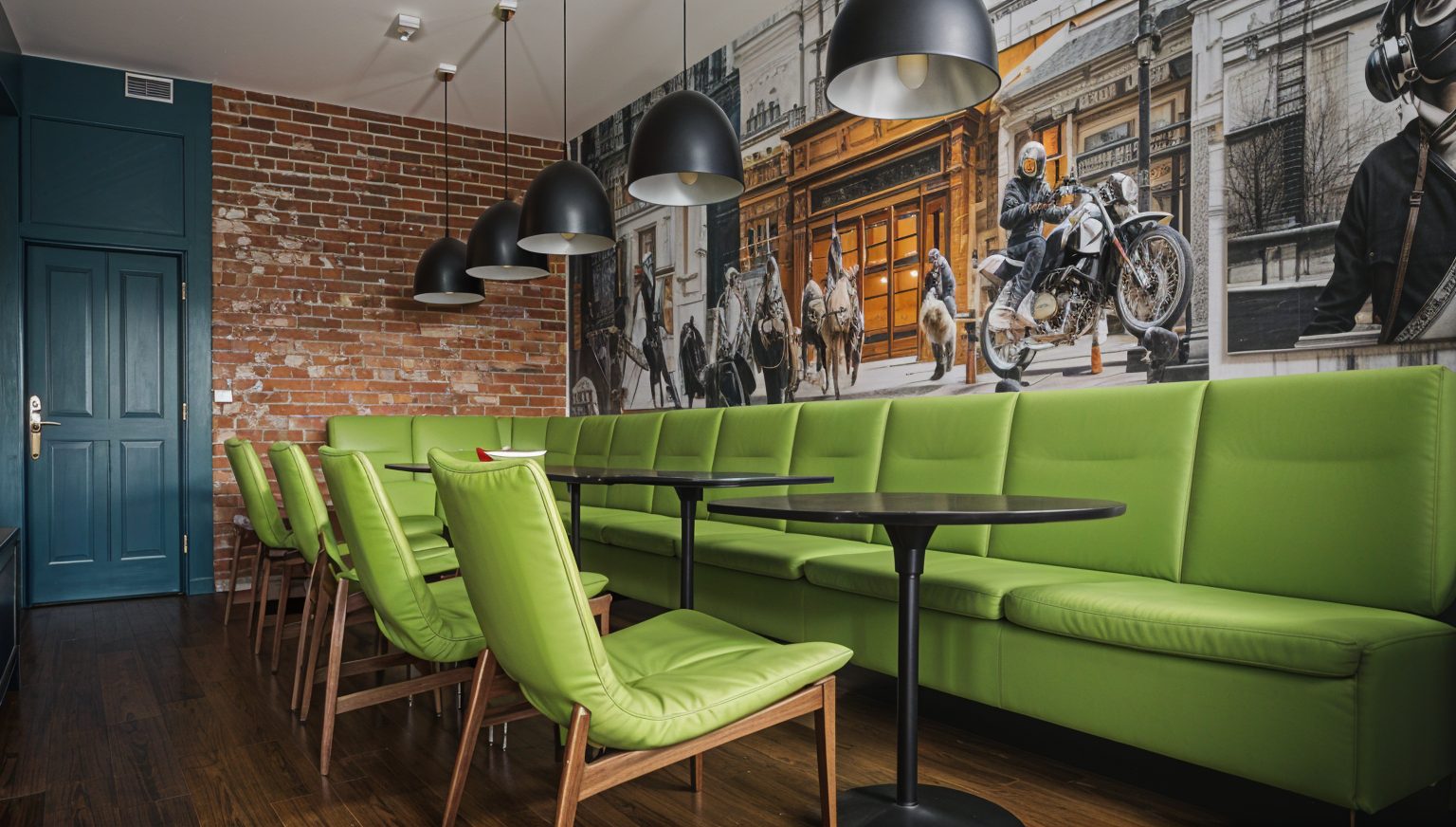 keep the same camera angle proportions and layout do not change or move any elements paint the sofa in green color natural soft green tone change the chairs mix green beige and light brown tones for a natural variety make the tables wooden with black marble pattern tops on the right wall add a flat tv and a few decorations such as pictures plants and small art pieces improve the lighting to make it brighter and warmer more realistic give the whole space a slightly more modern and elegant mediterranean look do not change the framing dimensions or furniture placement