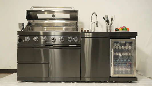 put this outdoor kitchen in a cabana made of black aluminum louvered pergola with aluminum side shutters with 2 teak lounge day beds