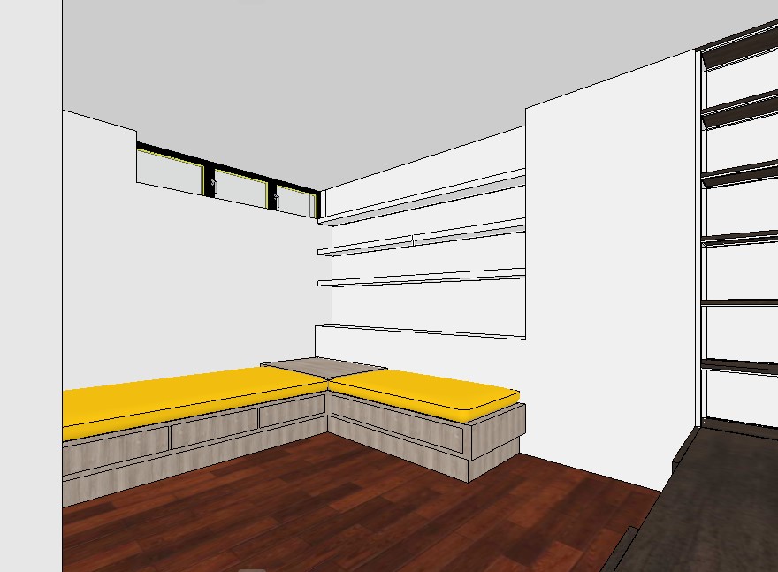 hyperrealistic interior render of basement tv room built sofa with beige fabric cushions add back cushions and decorative cushions fill shelves with books objects pots on wood surface of sofa add coffeetable book and small lamp woven vynil flooring glass coffee tabale ceiling lamp