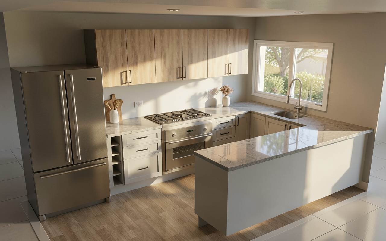 make photorealistic do not alter any elements maintain furniture style and finish add photorealistic people add a blurry landscape exterior