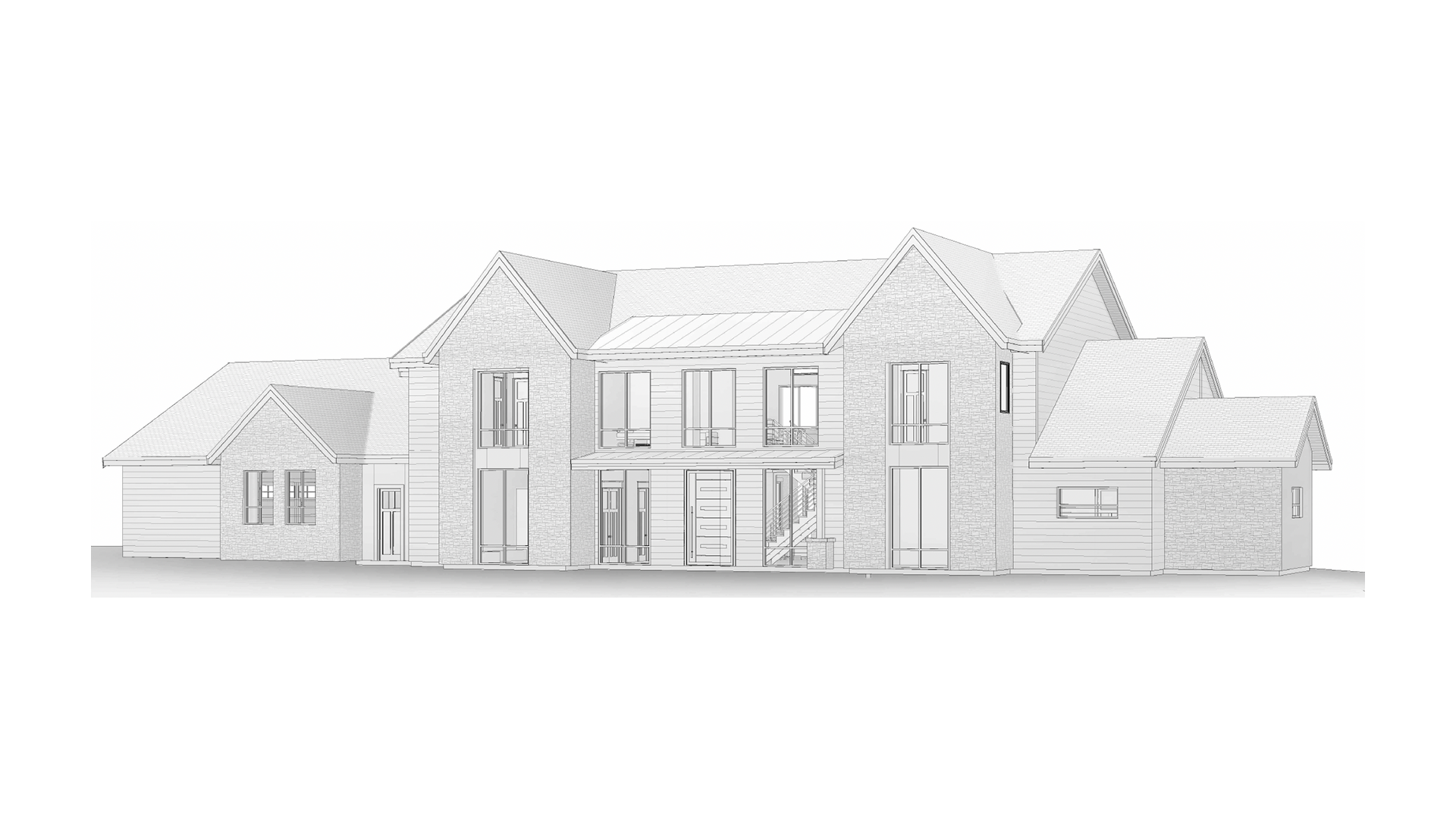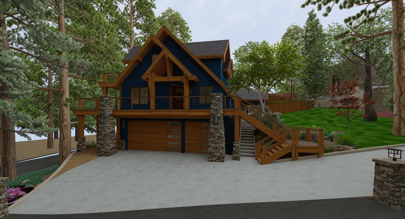 clean modern architectural exterior rendered in cinematic bright golden hour lighting cool tone stone siding under the gable ends dark charcoal tongue groove horizontal siding on the rest of exterior concrete driveway leading up to the house black overhang and sides around the front door black standing seam metal roof visible prominent cinematic hills and trees landscape in the background natural wood textures high fidelity photorealistic visualization crisp shadow falloff refined facade geometry richly detailed grain patterns soft atmospheric depth premium architectural photography mood ultra clean composition and materials