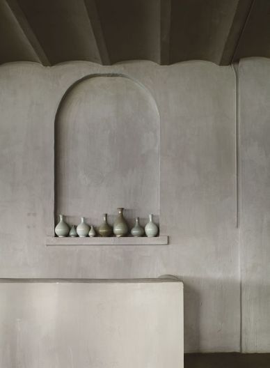 exterior shot the floor is stone the couh in th eback is built it same as the stone walls and cushions the kitchen on the left and right the top is in marble