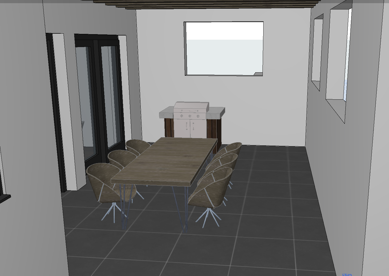 design a modern penthouse outdoor terrace with an outdoor kitchen and a comfortable dining area with a table and chairs the floor is anthracite ceramic tiles and the building facade is white use a cohesive material palette of anthracite dark walnut wood and light beige tones the outdoor kitchen should look sleek and modern integrated into the terrace design the dining area should feel elegant and comfortable suitable for relaxing and entertaining include modern outdoor furniture subtle lighting and a few decorative plants to add warmth and atmosphere the overall style should be contemporary minimal yet luxurious with clean lines and high end materials photorealistic architectural render soft natural daylight high detail realistic shadows modern penthouse atmosphere