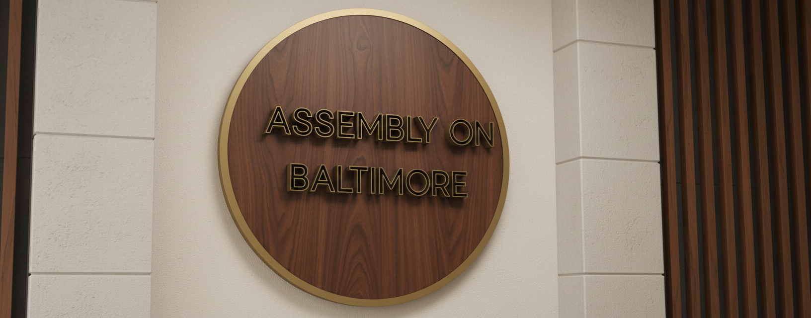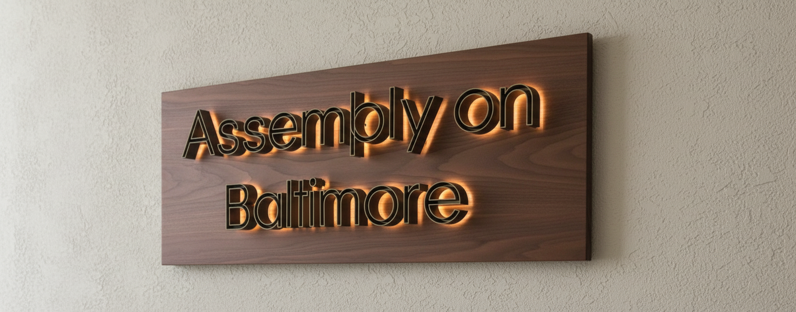 update this image to look the same in style and design but it needs to say assembly on baltimore make it 2 lines and something eye catching this is going to be an entry sign for a student housing project that is mid century modern make sure this matches the vibe add a back plate to it that feels relevant make it round remove the wood background make it feel more college student housing friendly