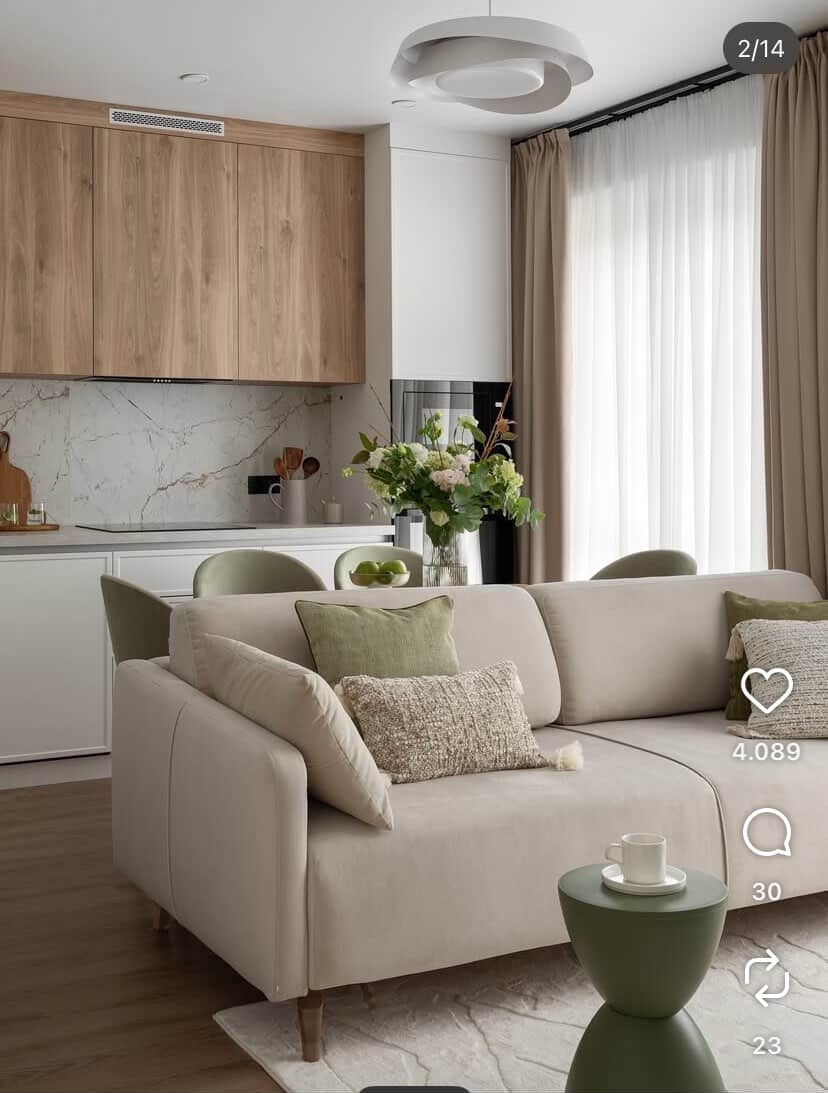 exterior shot modern family apartment interior filled with natural daylight warm and inviting atmosphere the 3d visualization must exactly match the provided drawing identical layout proportions furniture placement and spatial relationships central dining area with a large black chandelier above the table as a strong focal point round black dining table minimalist sofa with subtle gray details with a mirror positioned directly behind the sofa kitchen seating aligned with the dining table height with a platform made of white matte wood kitchen design features upper cabinets in blue and lower cabinets in white matching the white matte wood seating platform interior enriched with plants and flowers for freshness add a monochromatic rug to enhance comfort if the rug is blue it must be a muted desaturated tone not bright or vivid the interior color palette is strictly limited to wood black blue and white tones only romantic ambient lighting soft warm atmosphere high quality materials realistic textures clean modern aesthetic balanced composition keep the original model completely unchanged do not modify geometry layout furniture placement or proportions in any way the 3d result must be fully identical to the drawing with only materials colors textures and lighting adjusted photorealistic interior render high detail global illumination soft natural daylight subtle shadows