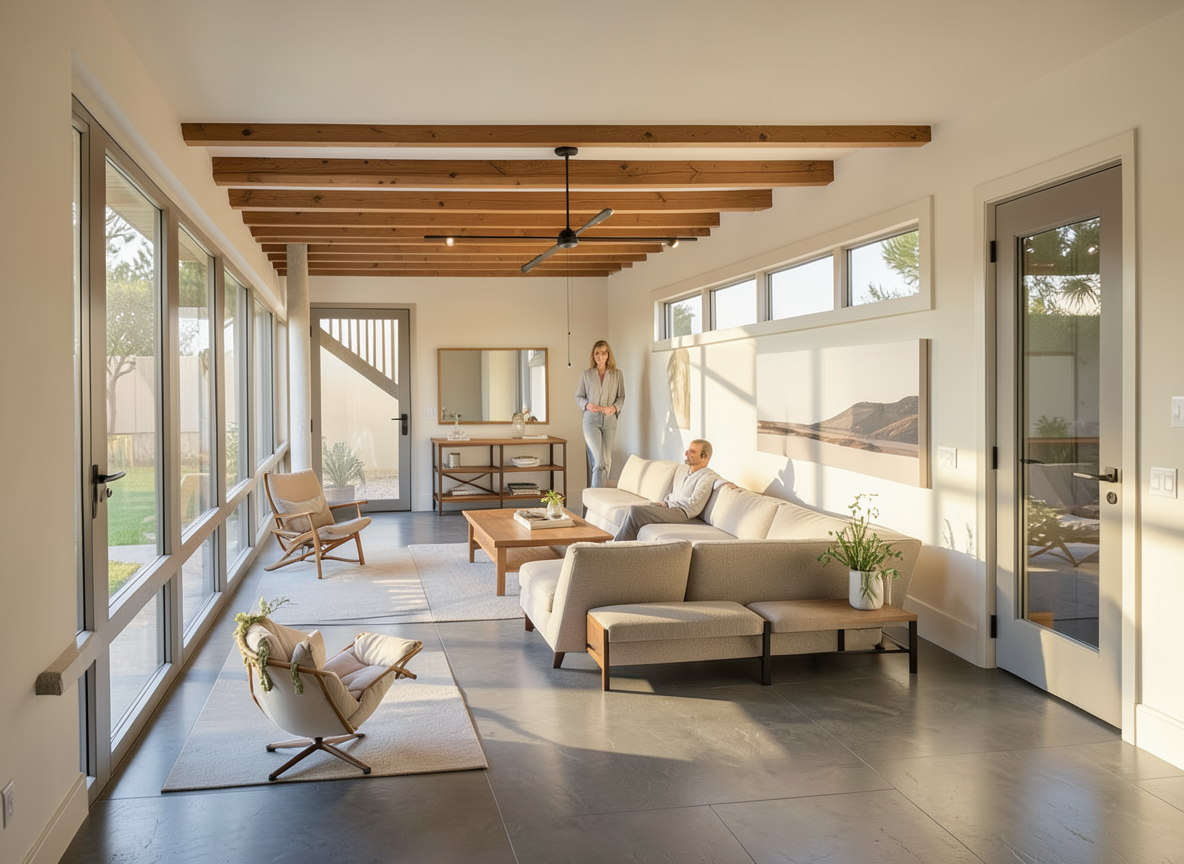 maintain architecture and proportions of input image use reference image for materials color palette and mood