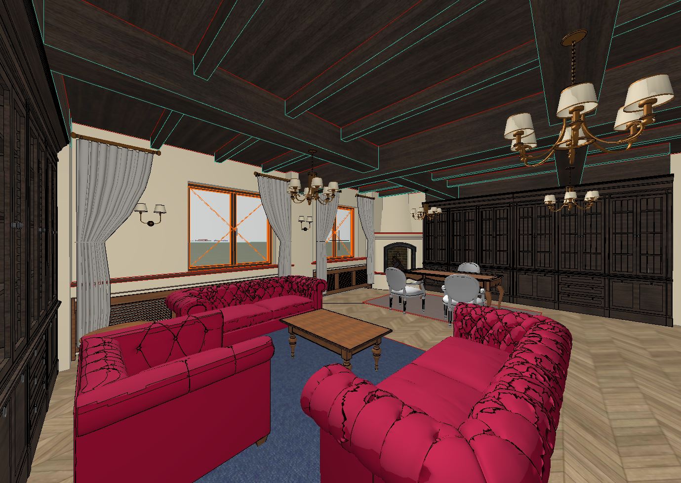 interior design of a classical manor the walls have beige limewash finish the flooring is hardwood floor herringbone pattern with a natural finish the ceiling has wood paneling with classic models the chandelier and sconces are light up and cast warm lights and their shadows touch the walls and give a dramatic effect on the right there is a desk that is hardwood oak natural finish the chairs around the desk have oak natural finish with burgundy colored velvet upholstery under the desk area there is a classical style carpet on the left there are two chesterfield sofas and one chesterfield chair that have all burgundy leather upholstery under the sofas area there is a large classical style carpet on the left wall there is a bookcase that has natural oak finish and is filled with books in the far center there is a large fireplace with classical trim marble countertops and with the fire burning on the far front wall there are two large windows with the warm sunlight coming in that casts soft shadows there are also classical white see trough drapes format picture 16 9 editorial style photo eye level time of day is noon extradetailed and ultrarealistic interior there are decorative elements all around to make it look more realistic all elements have sharp details subtle fabric wrinkles slight surface reflections natural daylight with soft shadows high detailed cinematic lighting color grading natural lighting global illumination ray tracing ambient occlusion chromatic aberration anti aliasing post processing super detailed